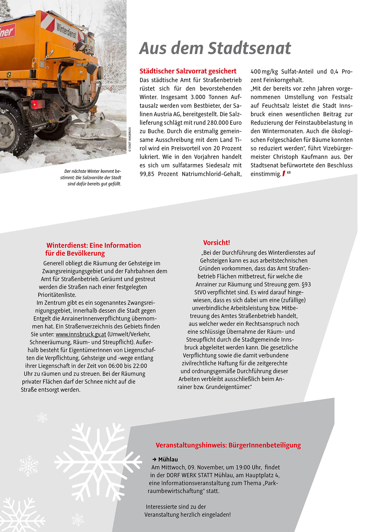 Winter. Insgesamt 3.000 Tonnen Auftausalz werden vom Bestbieter, der Salinen Austria AG, bereitgestellt. Die Salzlieferung schlägt mit rund 280.000 Euro