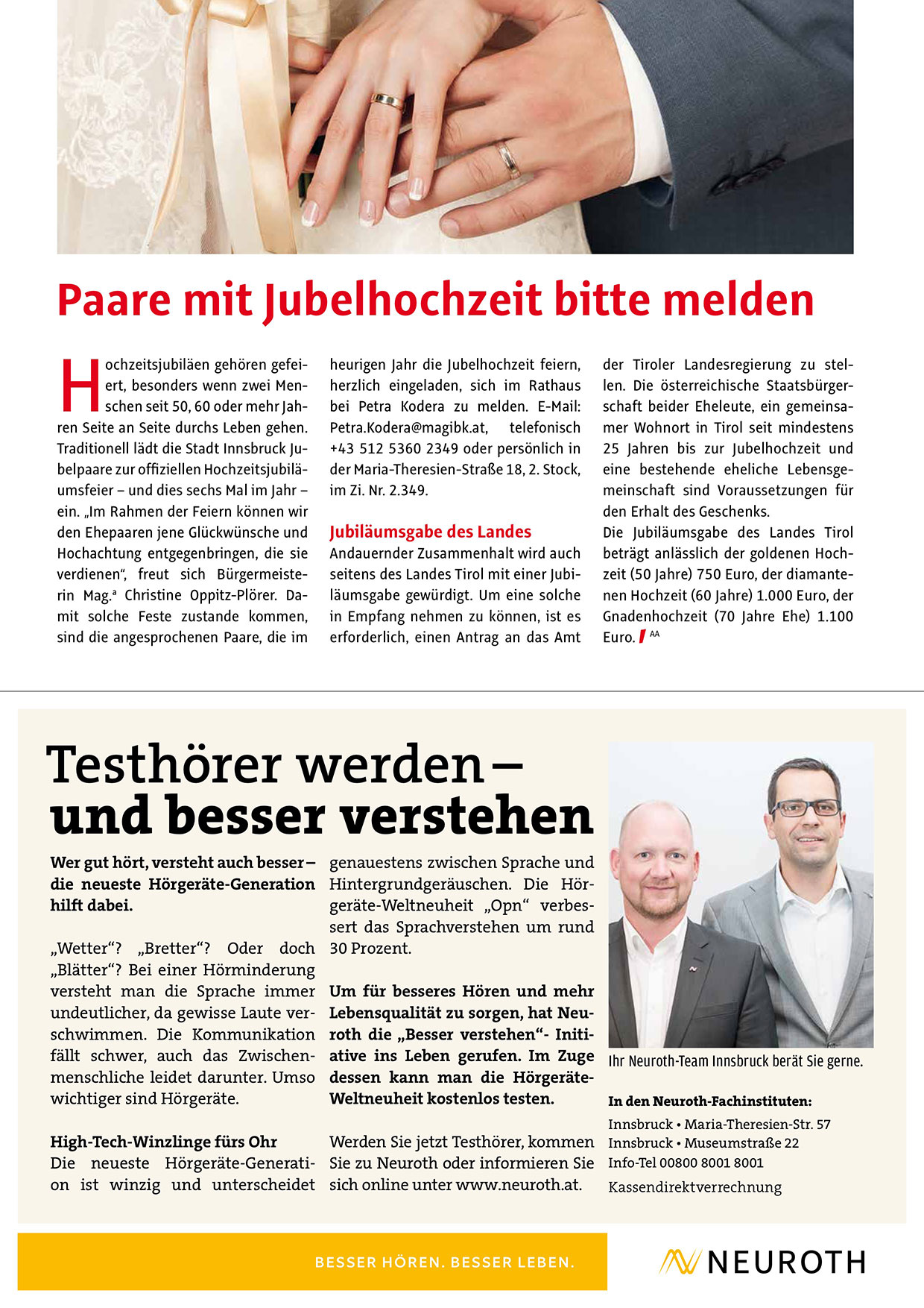 undeutlicher, da gewisse Laute ver- Lebensqualität zu sorgen, hat Neuschwimmen. Die Kommunikation roth die „Besser verstehen“- Initifällt schwer, auch das Zwischen- ative ins Leben gerufen. Im Zuge Ihr Neuroth-Team Innsbruck berät Sie gerne.