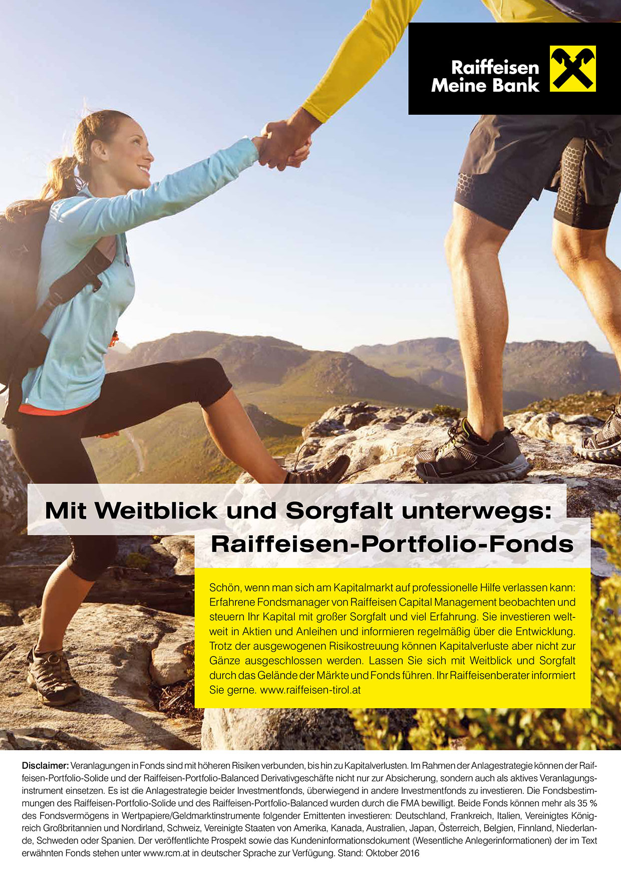 Disclaimer: Veranlagungen in Fonds sind mit höheren Risiken verbunden, bis hin zu Kapitalverlusten. Im Rahmen der Anlagestrategie können der Raiffeisen-Portfolio-Solide und der Raiffeisen-Portfolio-Balanced Derivativgeschäfte nicht nur zur Absicherung, sondern auch als aktives Veranlagungsinstrument einsetzen. Es ist die Anlagestrategie beider Investmentfonds, überwiegend in andere Investmentfonds zu investieren. Die Fondsbestimmungen des Raiffeisen-Portfolio-Solide und des Raiffeisen-Portfolio-Balanced wurden durch die FMA bewilligt. Beide Fonds können mehr als 35 %