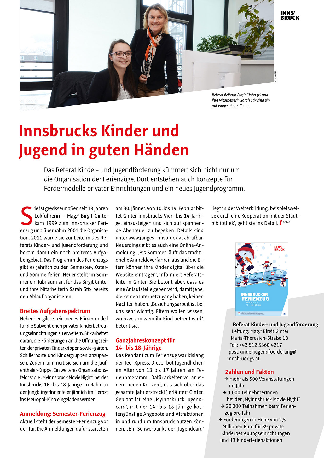 Schülerhorte und Kindergruppen anzupassen. Zudem kümmert sie sich um die Jaufenthaler-Krippe. Ein weiteres Organisationsfeld ist die „MyInnsbruck Movie Night“, bei der