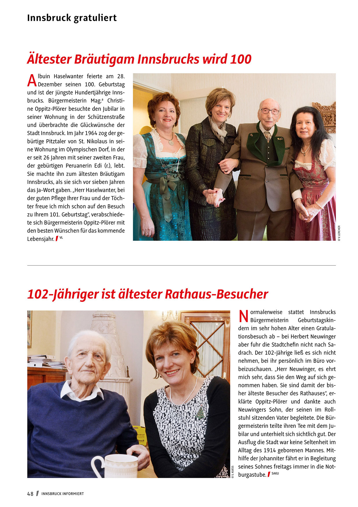 und ist der jüngste Hundertjährige Innsbrucks. Bürgermeisterin Mag.a Christine Oppitz-Plörer besuchte den Jubilar in