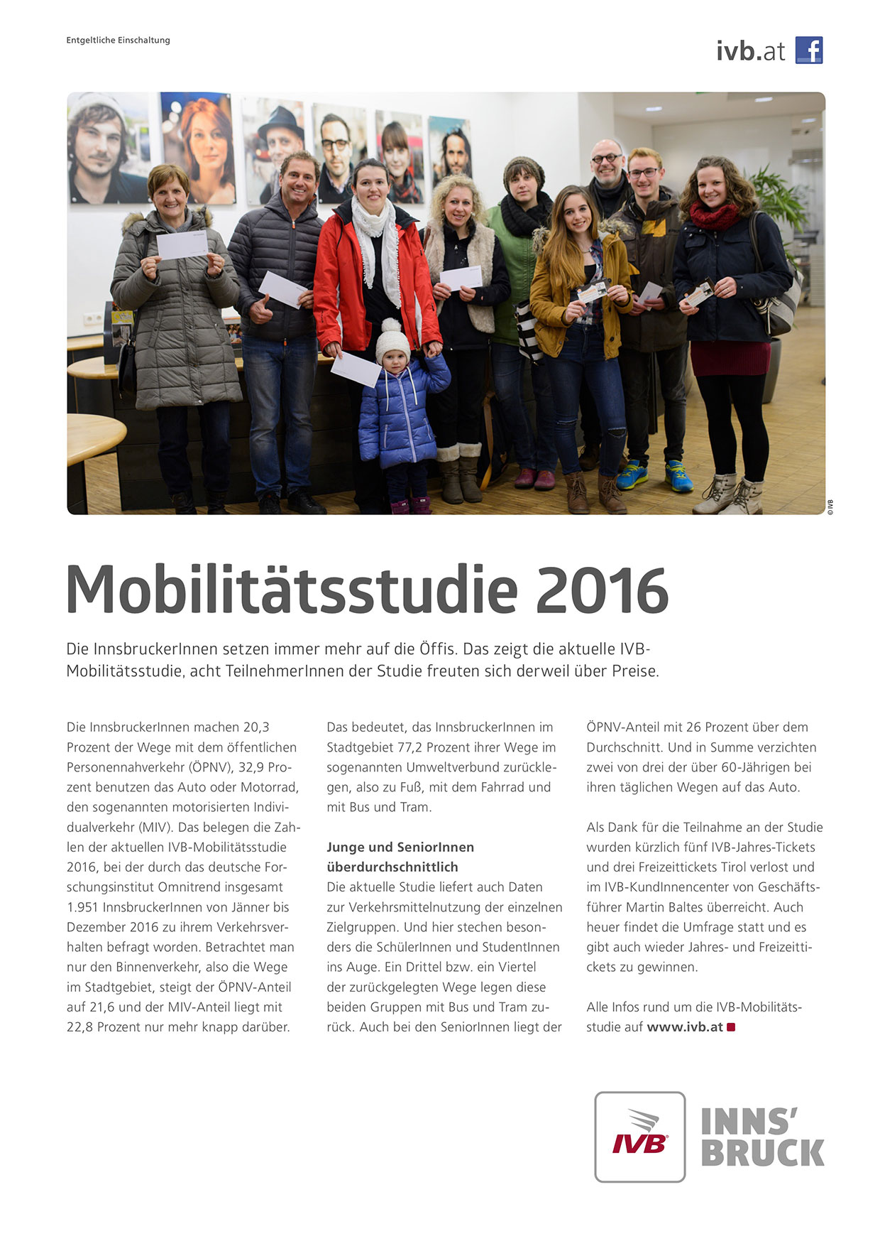 Die InnsbruckerInnen setzen immer mehr auf die Öffis. Das zeigt die aktuelle IVBMobilitätsstudie, acht TeilnehmerInnen der Studie freuten sich derweil über Preise.