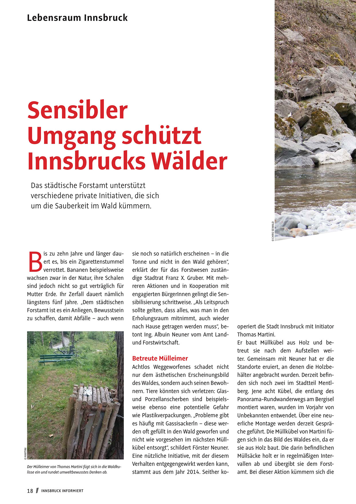 Unbekannten entwendet. Über eine neuerliche Montage werden derzeit Gespräche geführt. Die Müllkübel von Martini fügen sich in das Bild des Waldes ein, da er