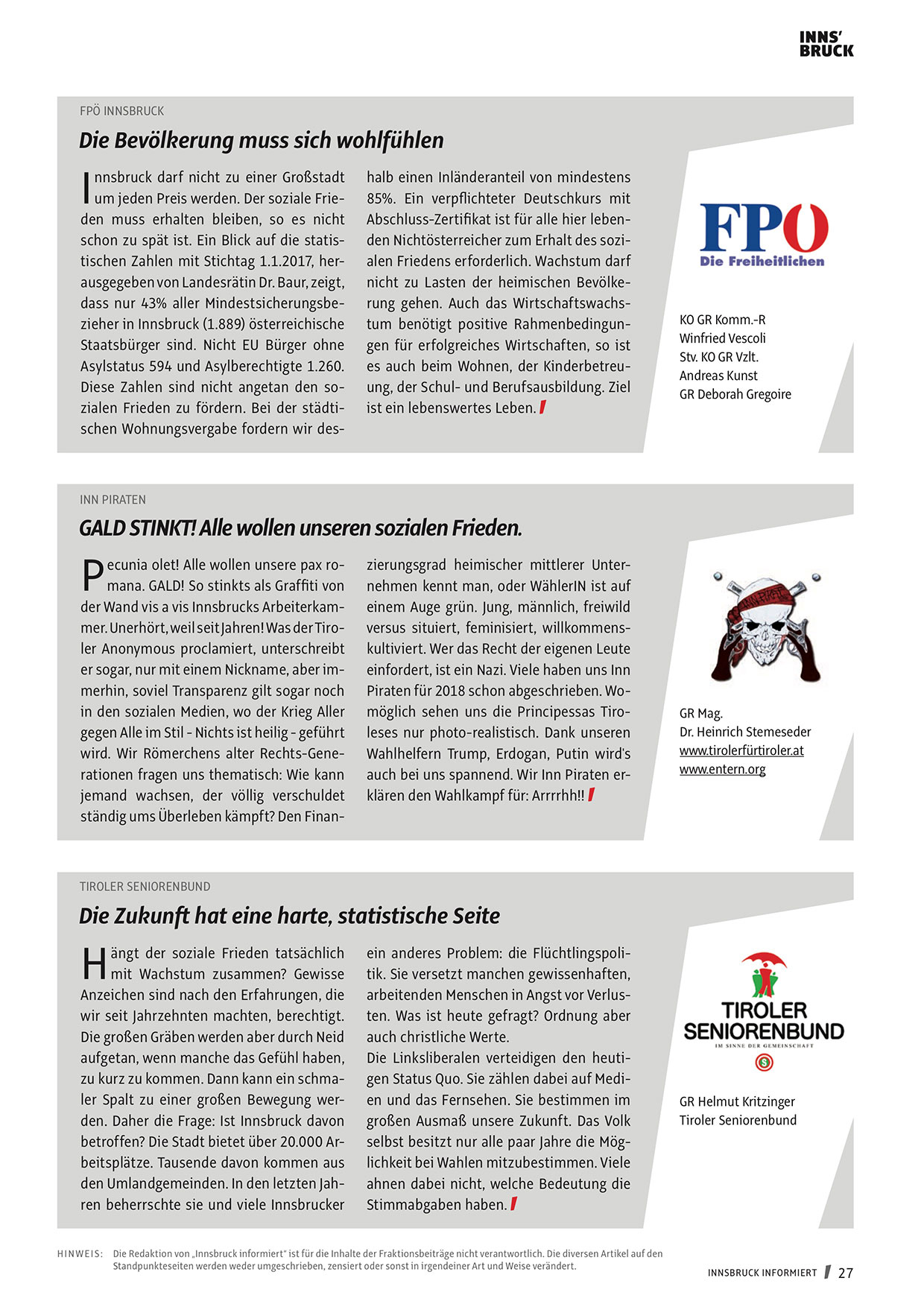 H I N W EI S : Die Redaktion von „Innsbruck informiert“ ist für die Inhalte der Fraktionsbeiträge nicht verantwortlich. Die diversen Artikel auf den