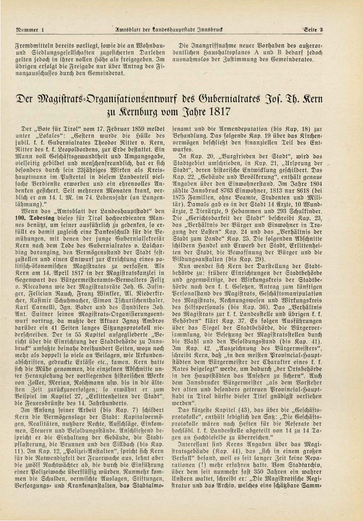 Kern nach dem Tode des Gubernialrates u. Laicharding daranging, den Vermögensstand der Stadt festzustellen und einen Entwurf zur Errichtung eines politisch-ökonomischen Magistrates zu verfassen. Als