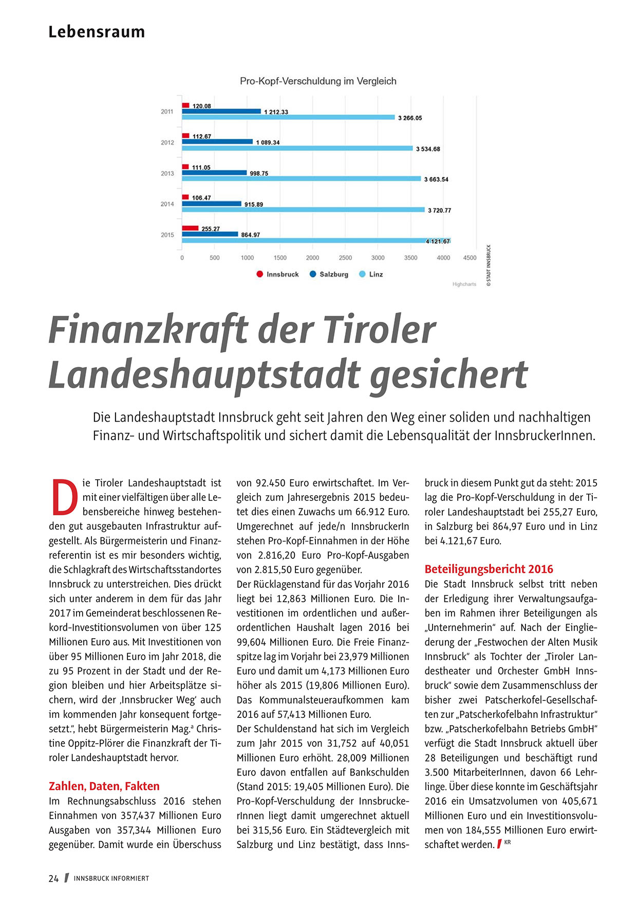 lag die Pro-Kopf-Verschuldung in der Tiroler Landeshauptstadt bei 255,27 Euro,