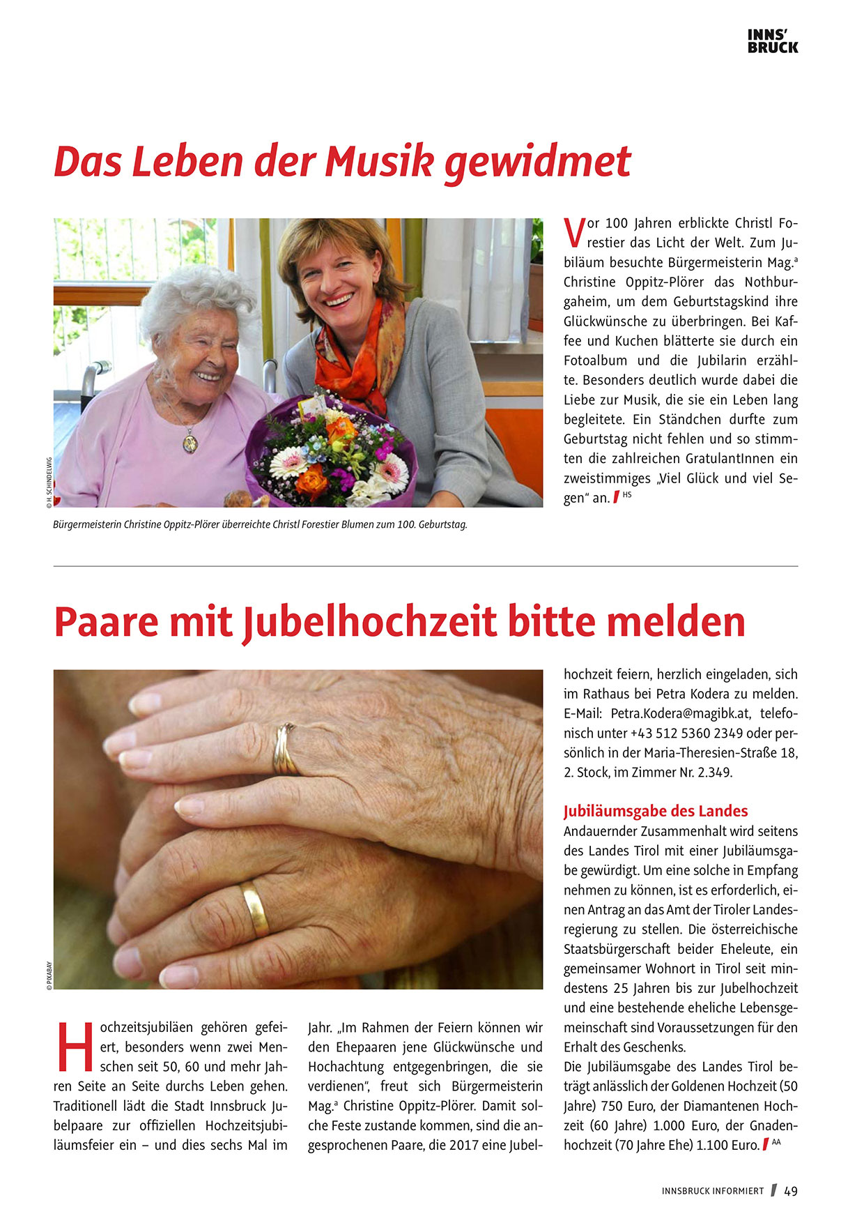 Traditionell lädt die Stadt Innsbruck Jubelpaare zur offiziellen Hochzeitsjubiläumsfeier ein – und dies sechs Mal im
