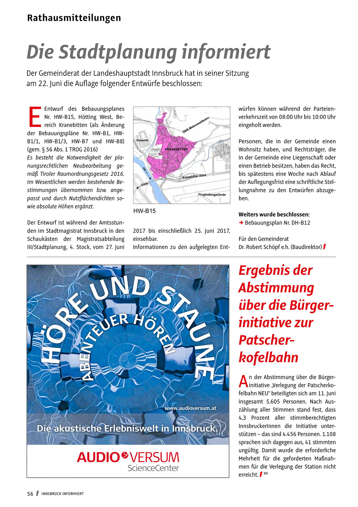 Der Entwurf ist während der Amtsstunden im Stadtmagistrat Innsbruck in den
