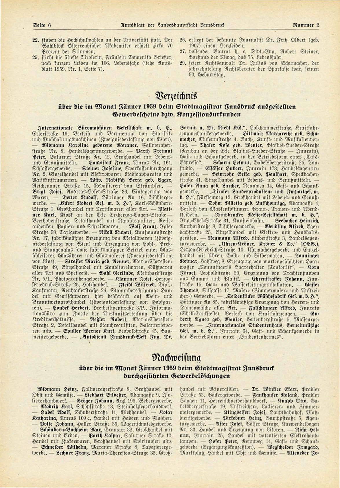 über die im Monat Jänner 1959 beim Stadtmaqistrat Innsbruck ausgestellten