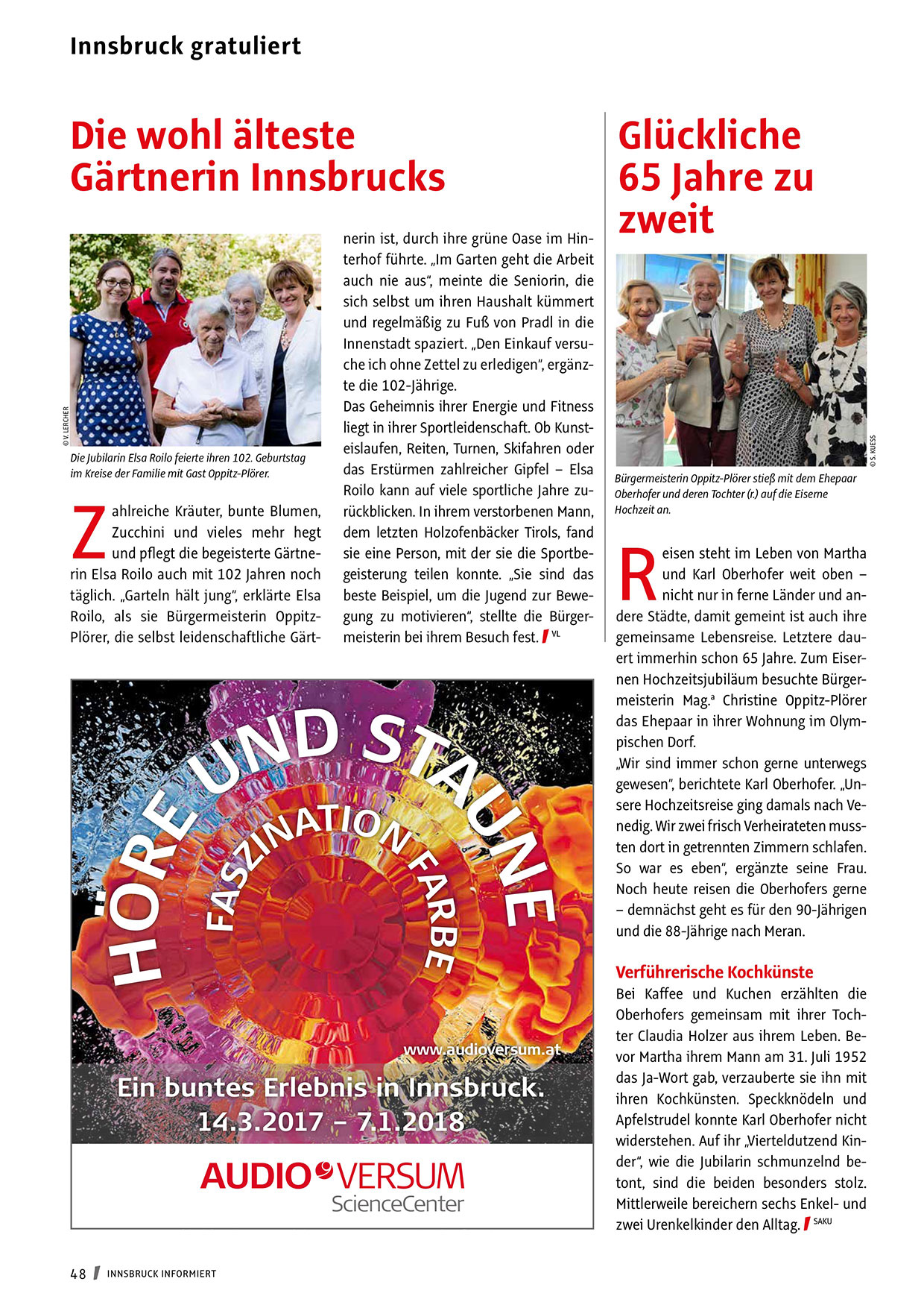 gemeinsame Lebensreise. Letztere dauert immerhin schon 65 Jahre. Zum Eisernen Hochzeitsjubiläum besuchte Bürgermeisterin Mag.a Christine Oppitz-Plörer