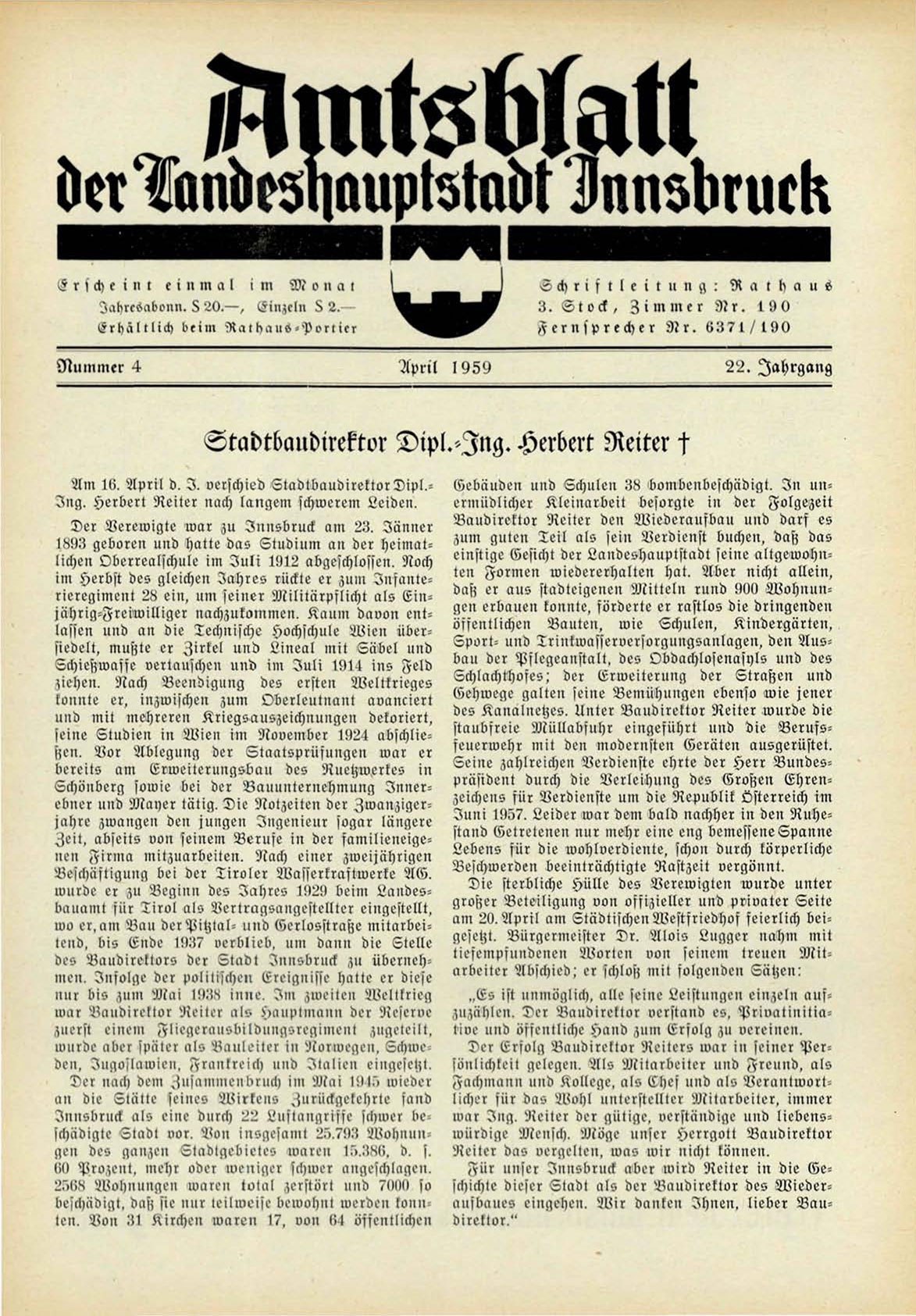 Am Ili. A p r i l d. I . verschied StadtbaudirettorDipl.I n g . Herbert Reiter nach langem schwerem Leiden.