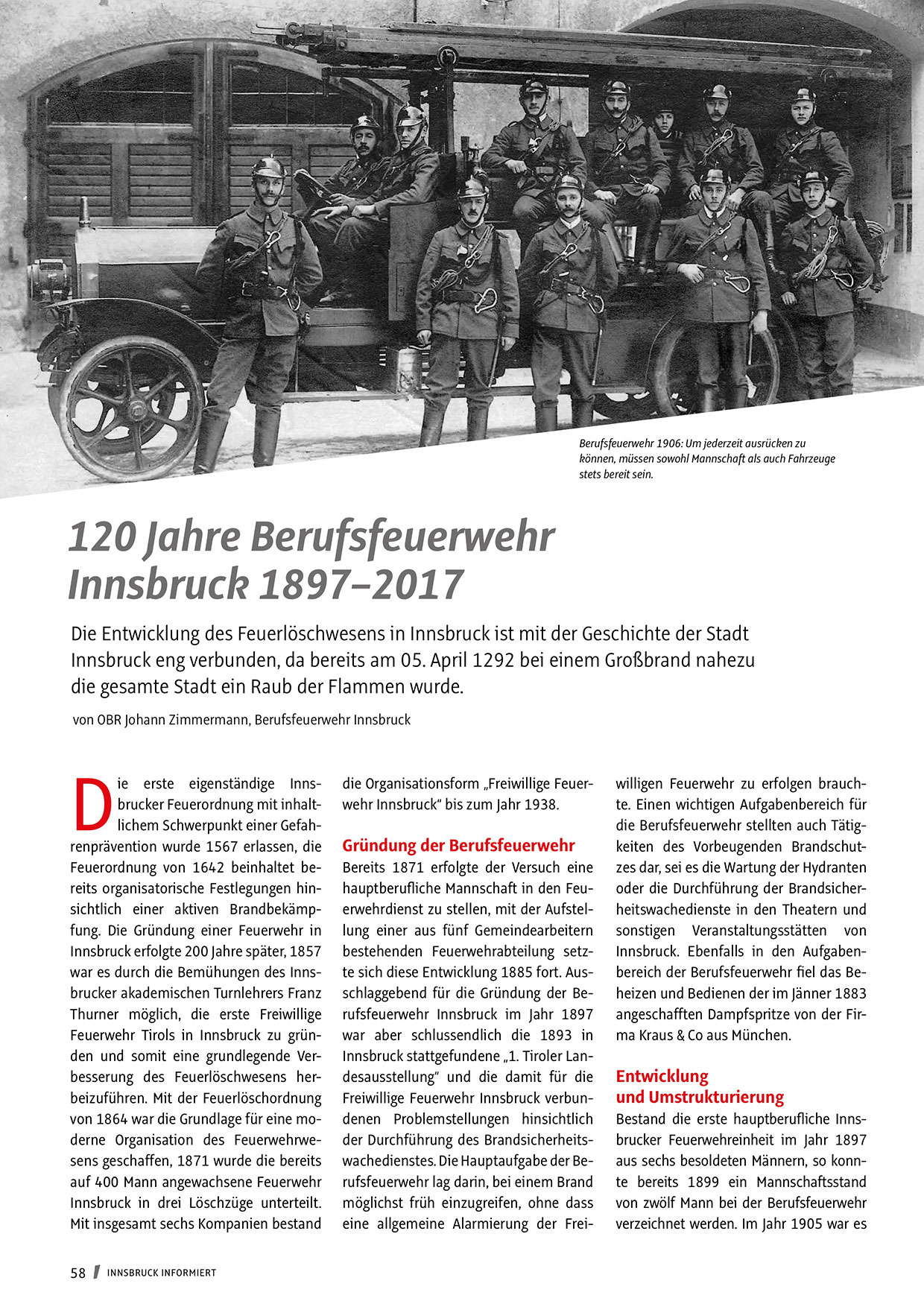 bestehenden Feuerwehrabteilung setzte sich diese Entwicklung 1885 fort. Ausschlaggebend für die Gründung der Berufsfeuerwehr Innsbruck im Jahr 1897