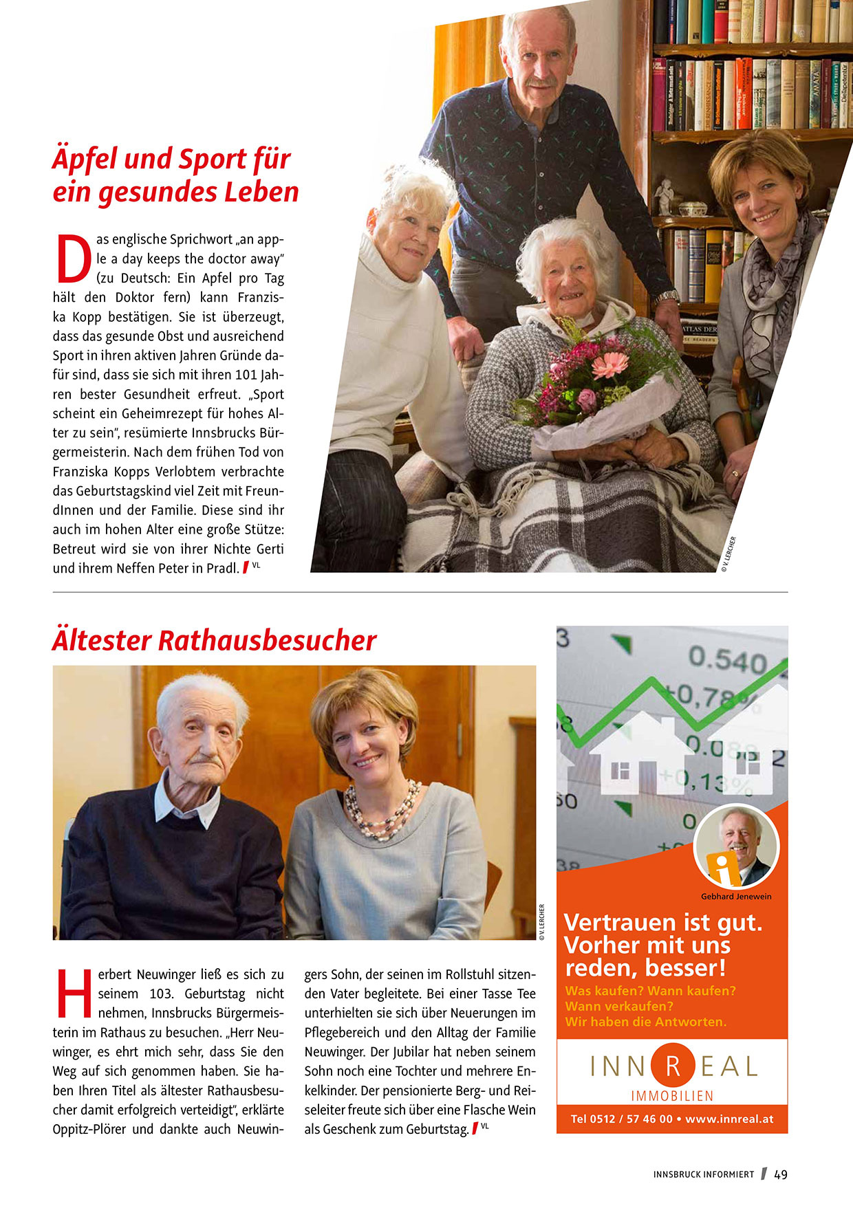 scheint ein Geheimrezept für hohes Alter zu sein“, resümierte Innsbrucks Bürgermeisterin. Nach dem frühen Tod von