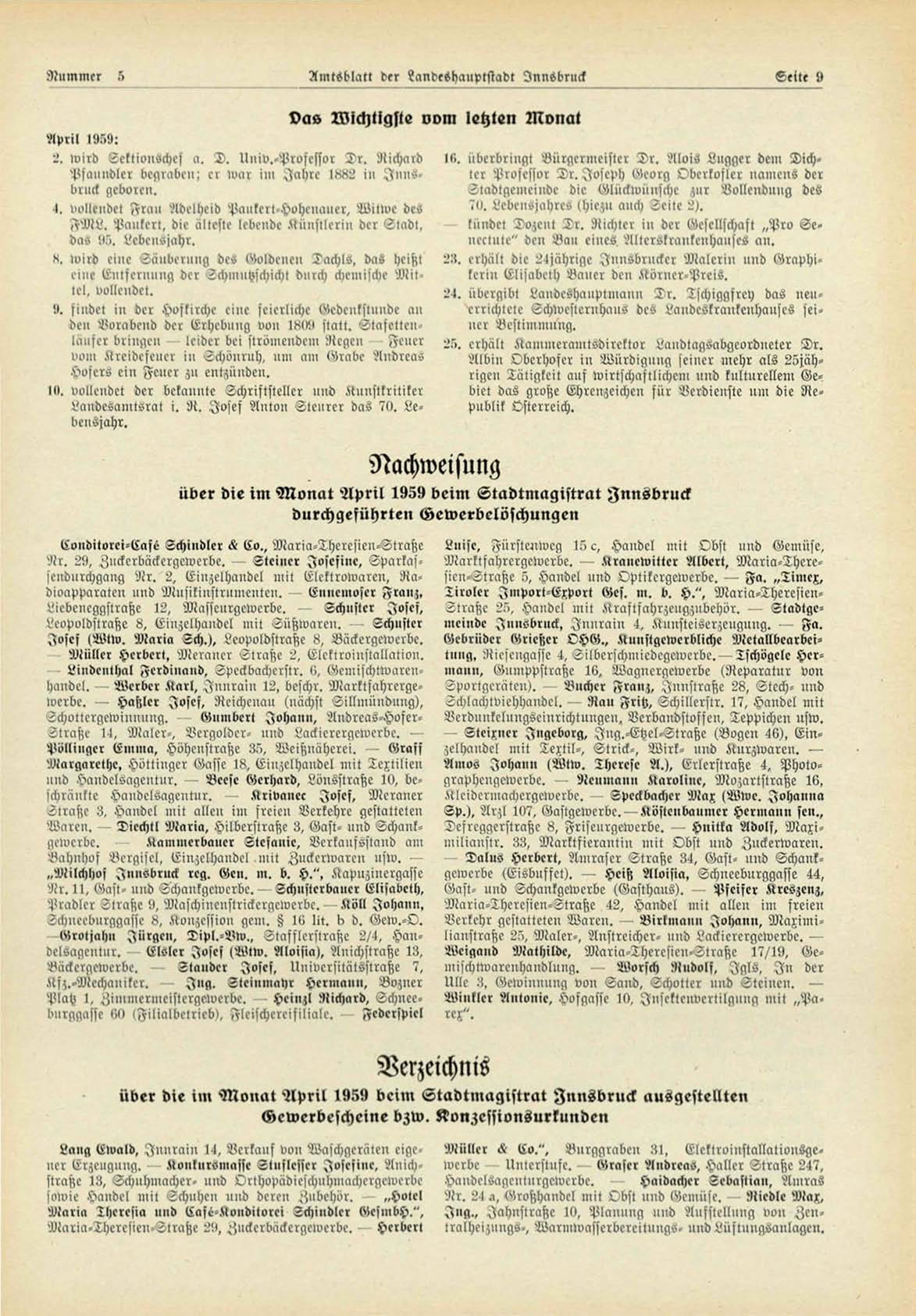 über die im Monat April 1959 beim Stadtmagistrat Innsbruck