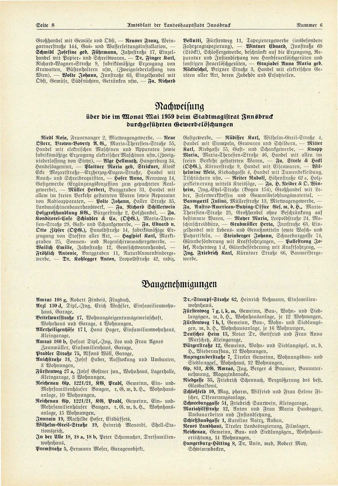 über die im Monat M a i 1959 beim Stadtmagistrat Innsbruck
