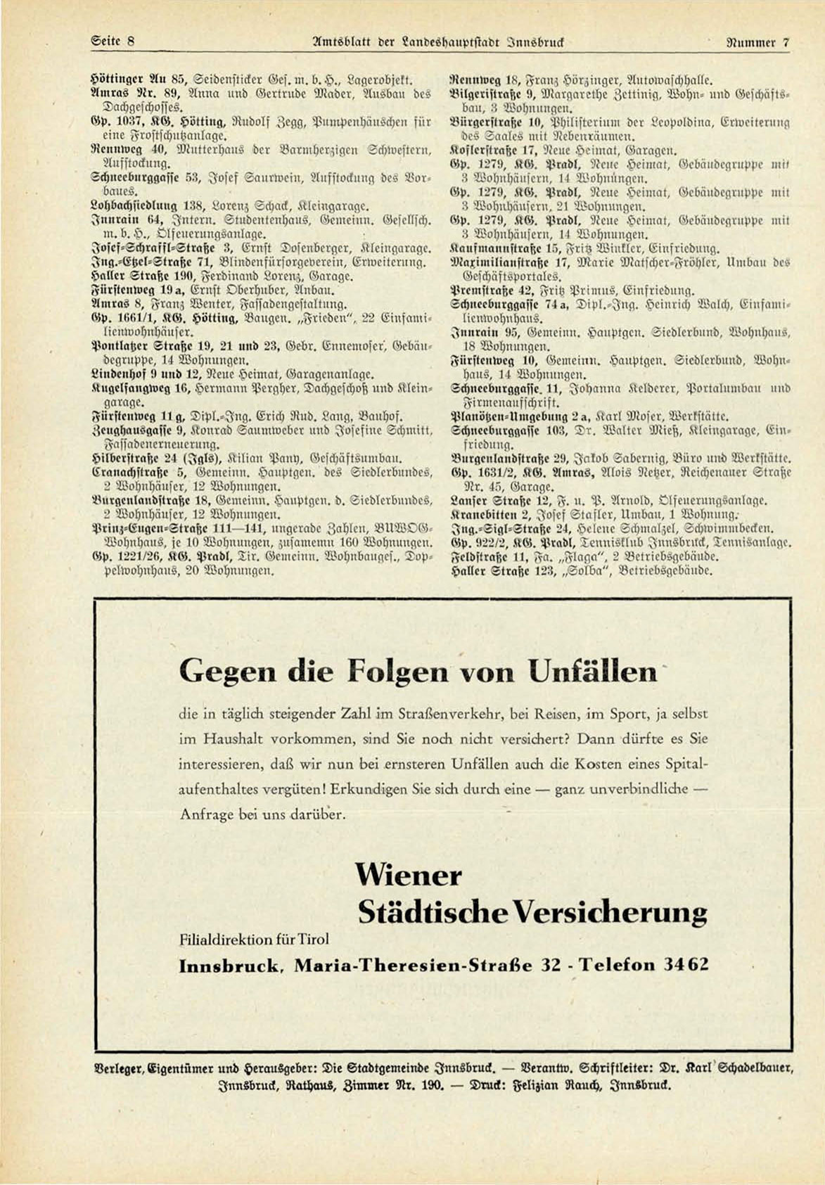 Verleger, Eigentümer und Herausgeber: Die Stadtgemeinde Innsbruck. — Verantw. Schriftleiter: Dr. Karl Schadelbauer,