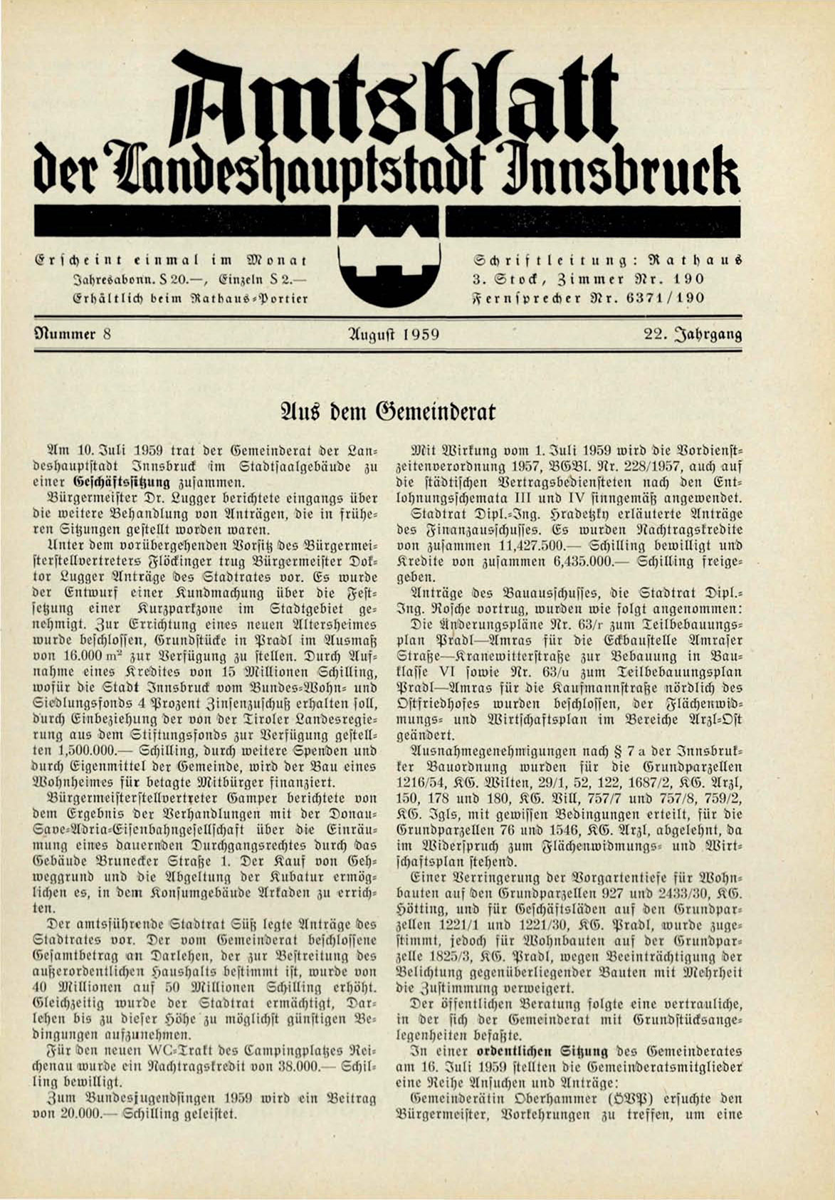 Am 10. J u l i 1959 trat der Gemeinderat der Landeshauptstadt Innsbruck einer ltzeschäftssitzung zusammen.