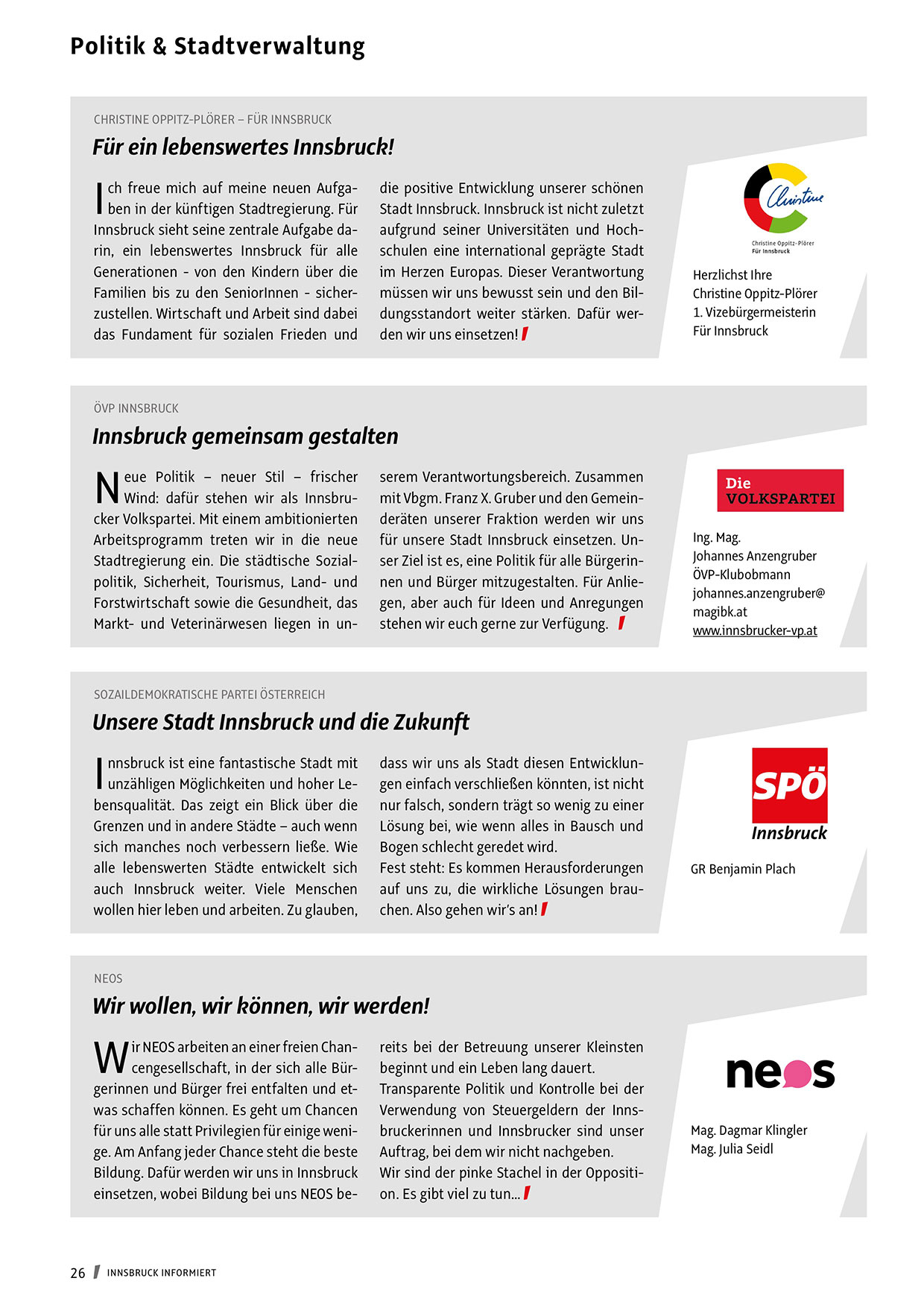 für unsere Stadt Innsbruck einsetzen. Unser Ziel ist es, eine Politik für alle Bürgerinnen und Bürger mitzugestalten. Für Anliegen, aber auch für Ideen und Anregungen