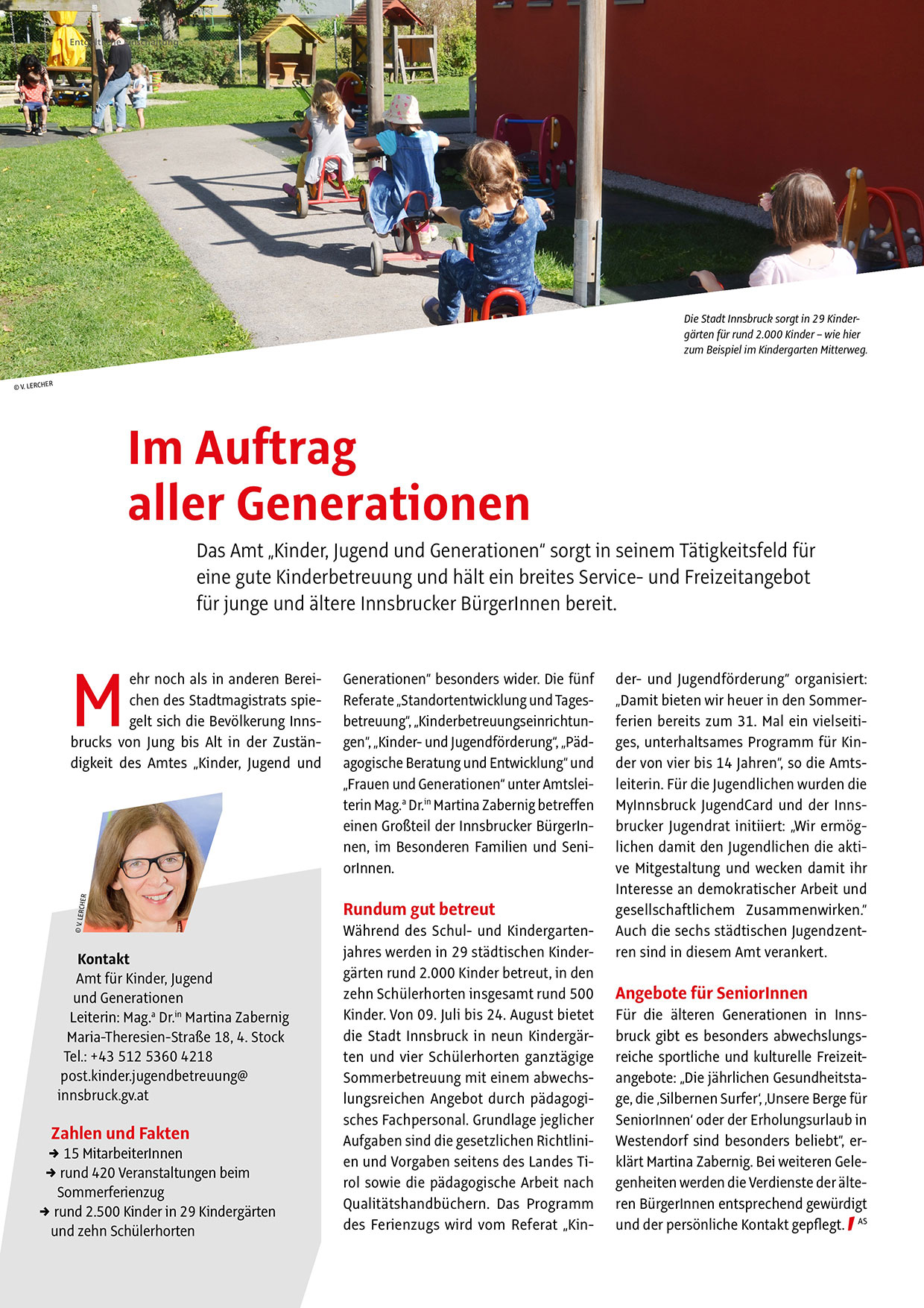 ehr noch als in anderen Bereichen des Stadtmagistrats spiegelt sich die Bevölkerung Innsbrucks von Jung bis Alt in der Zuständigkeit des Amtes „Kinder, Jugend und