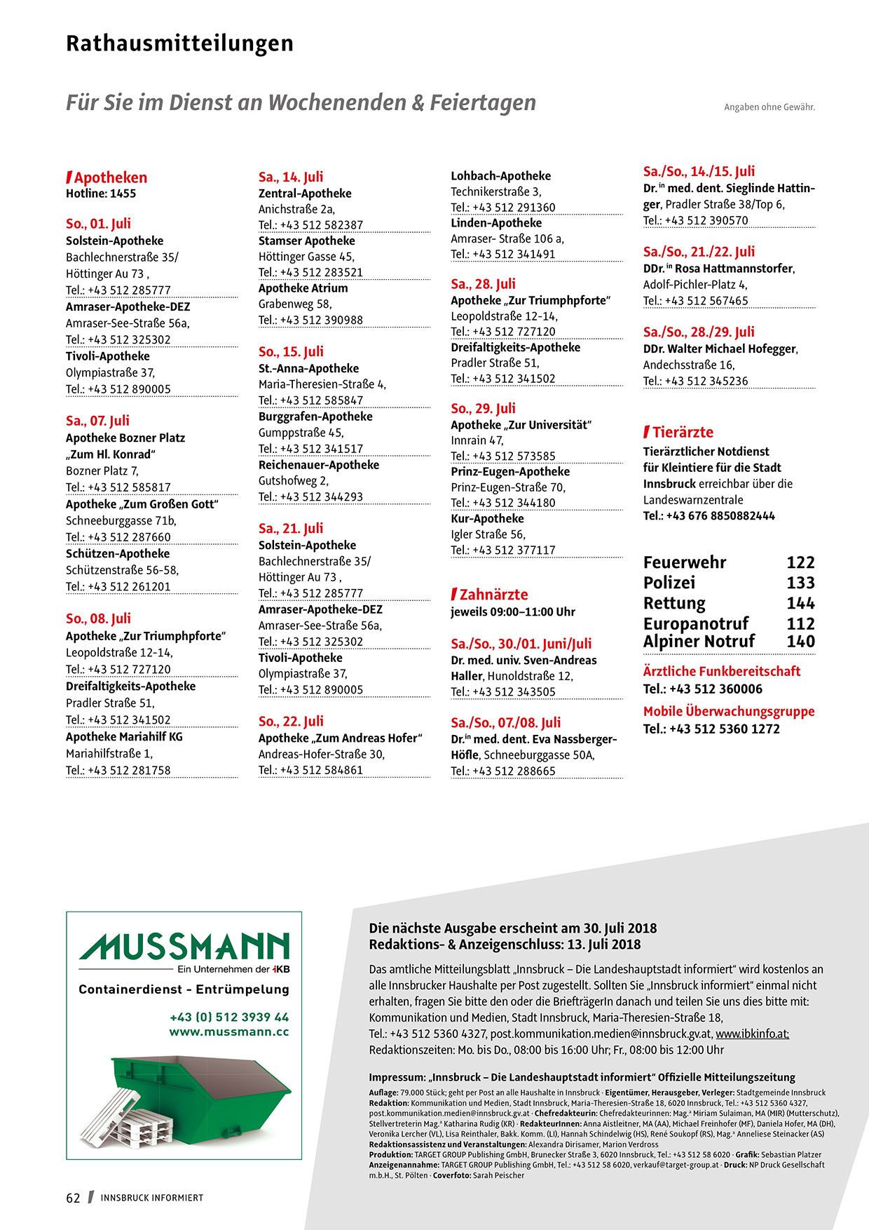 Impressum: „Innsbruck – Die Landeshauptstadt informiert“ Offizielle Mitteilungszeitung