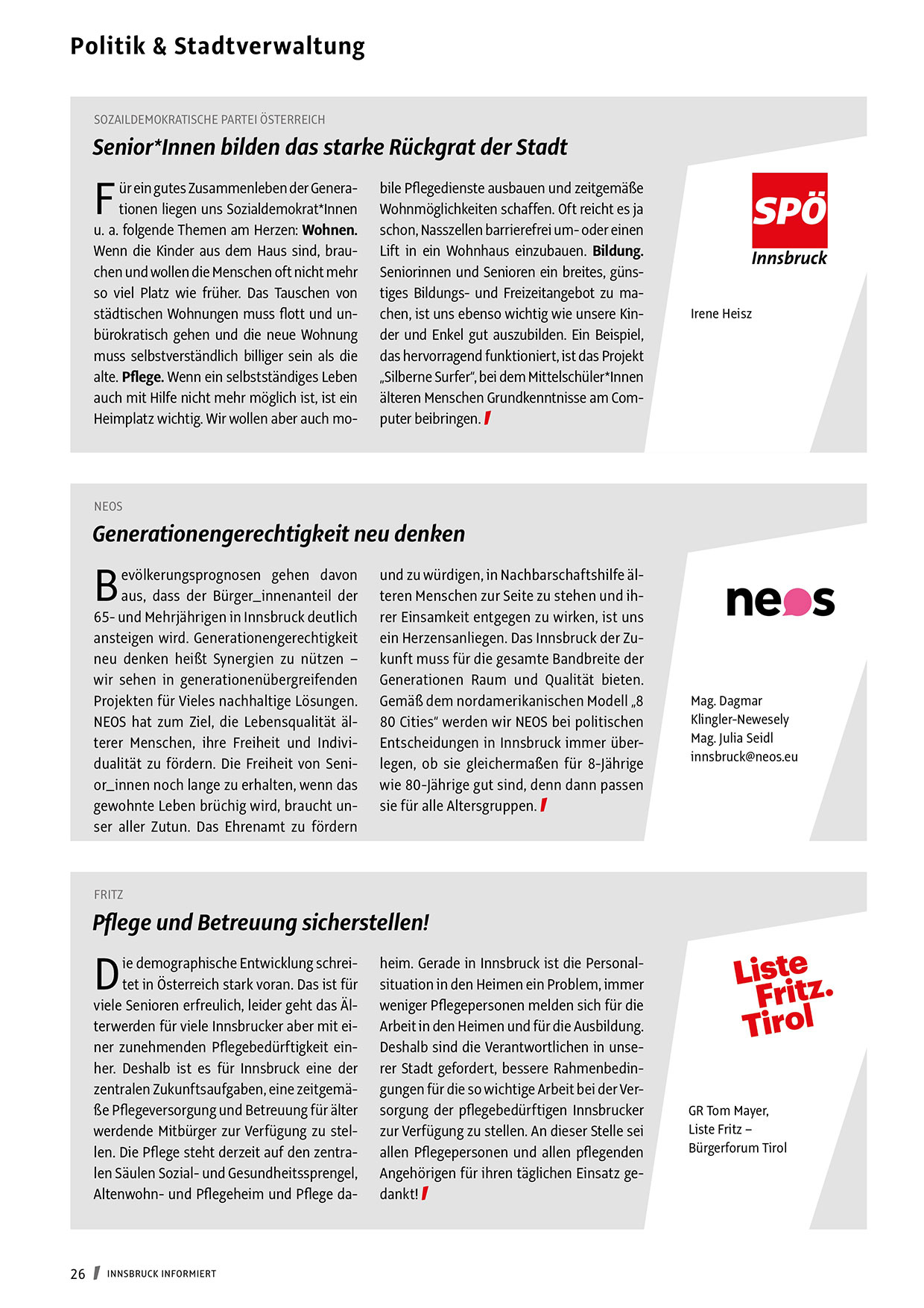 viele Senioren erfreulich, leider geht das Älterwerden für viele Innsbrucker aber mit einer zunehmenden Pflegebedürftigkeit einher. Deshalb ist es für Innsbruck eine der