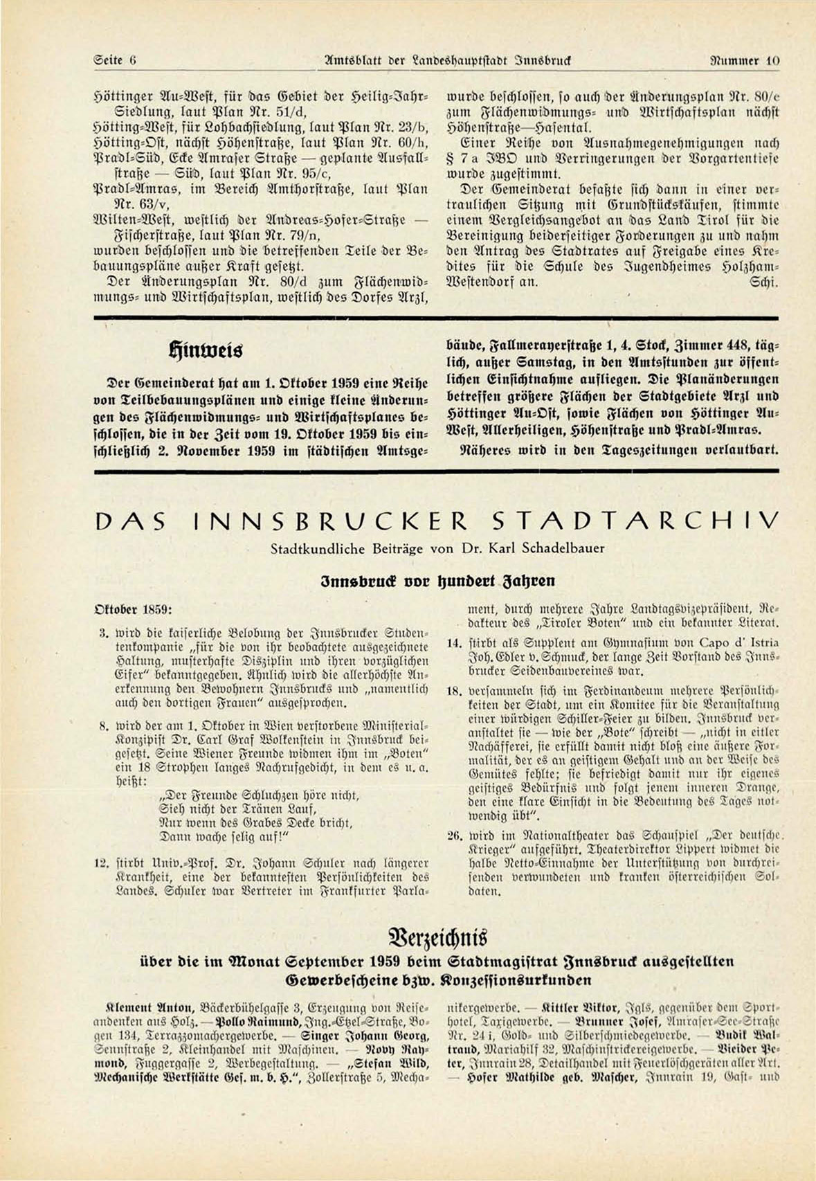 über die im Monat September 1959 beim Stadtmagistrat Innsbruck ausgestellten