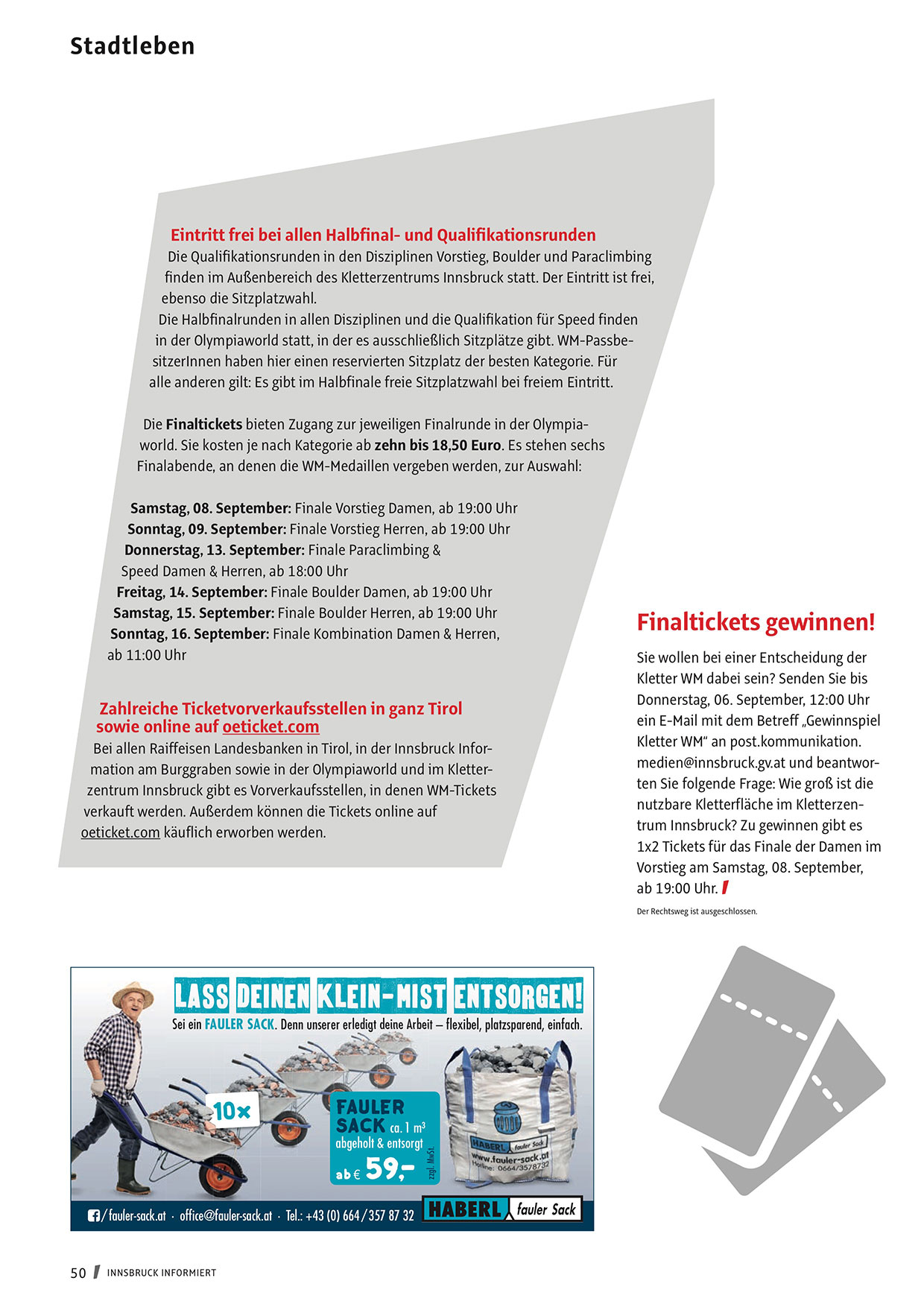 Bei allen Raiffeisen Landesbanken in Tirol, in der Innsbruck Information am Burggraben sowie in der Olympiaworld und im Kletterzentrum Innsbruck gibt es Vorverkaufsstellen, in denen WM-Tickets