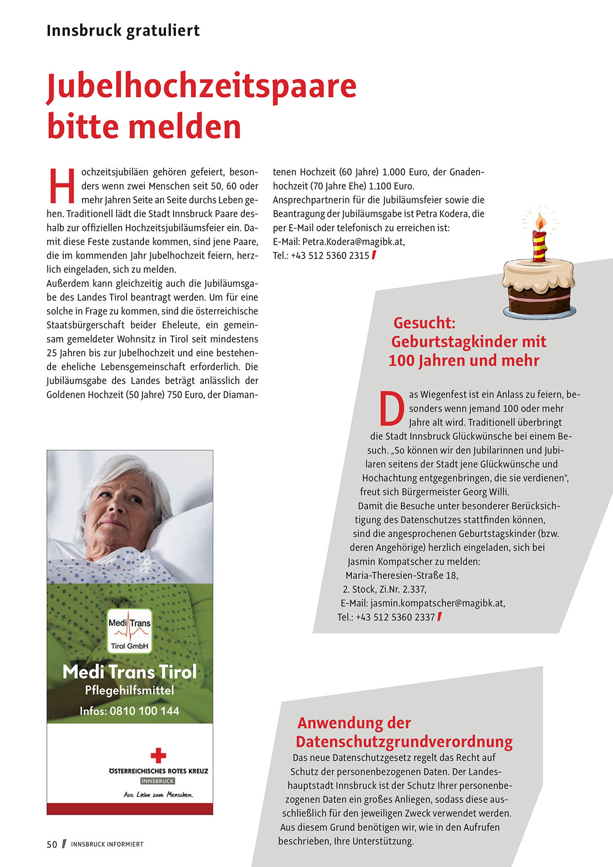 mehr Jahren Seite an Seite durchs Leben gehen. Traditionell lädt die Stadt Innsbruck Paare deshalb zur offiziellen Hochzeitsjubiläumsfeier ein. Damit diese Feste zustande kommen, sind jene Paare,