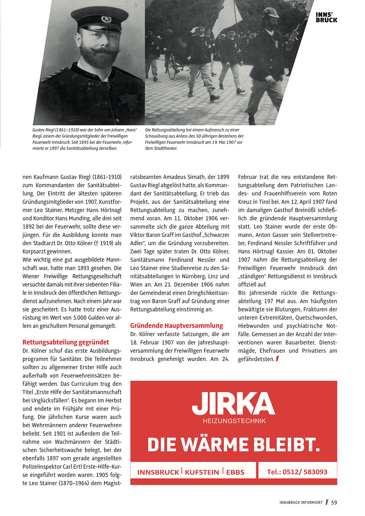 Feuerwehr Innsbruck. Seit 1895 bei der Feuerwehr, reformierte er 1897 die Sanitätsabteilung derselben.
