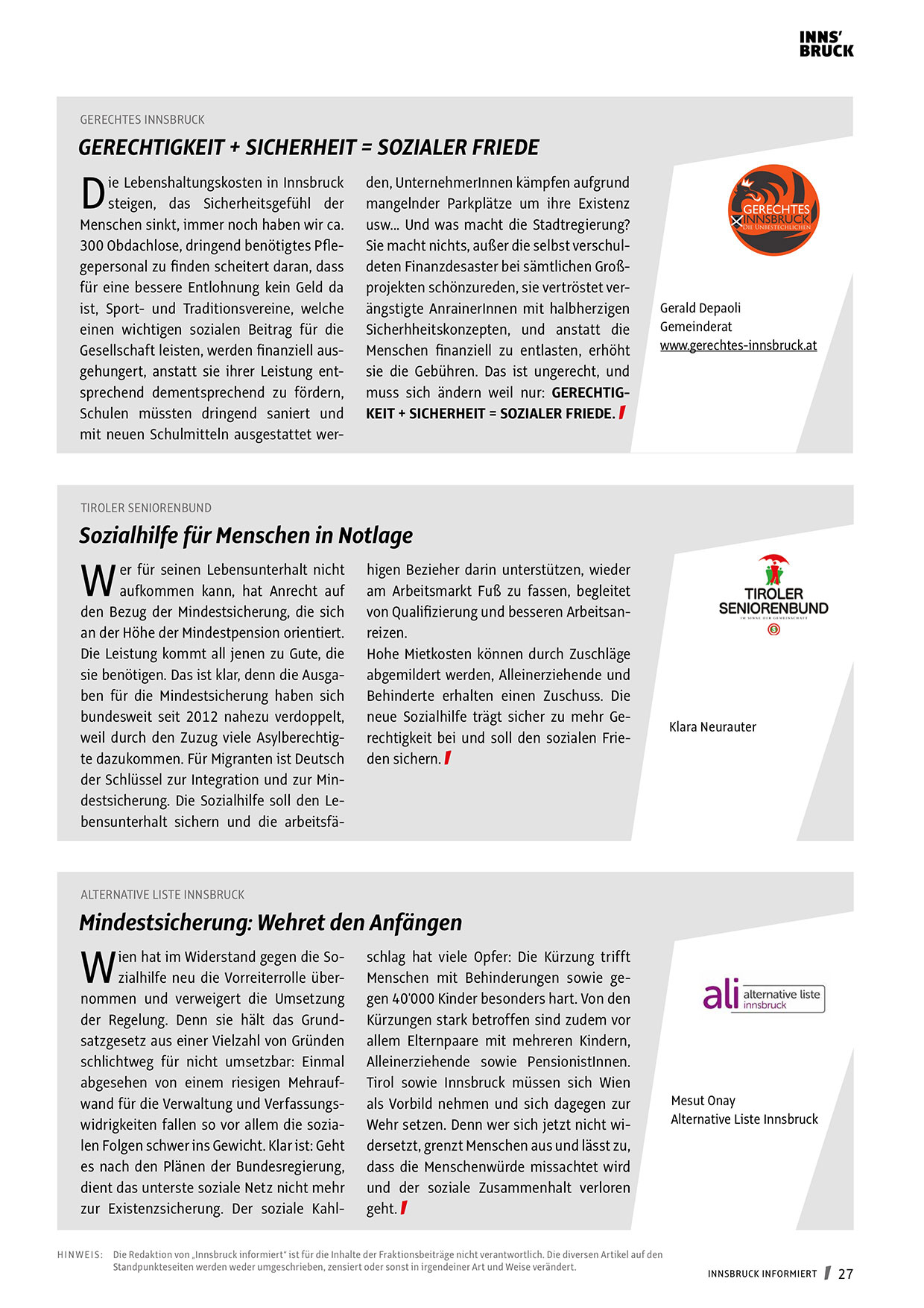 H I N W EI S : Die Redaktion von „Innsbruck informiert“ ist für die Inhalte der Fraktionsbeiträge nicht verantwortlich. Die diversen Artikel auf den