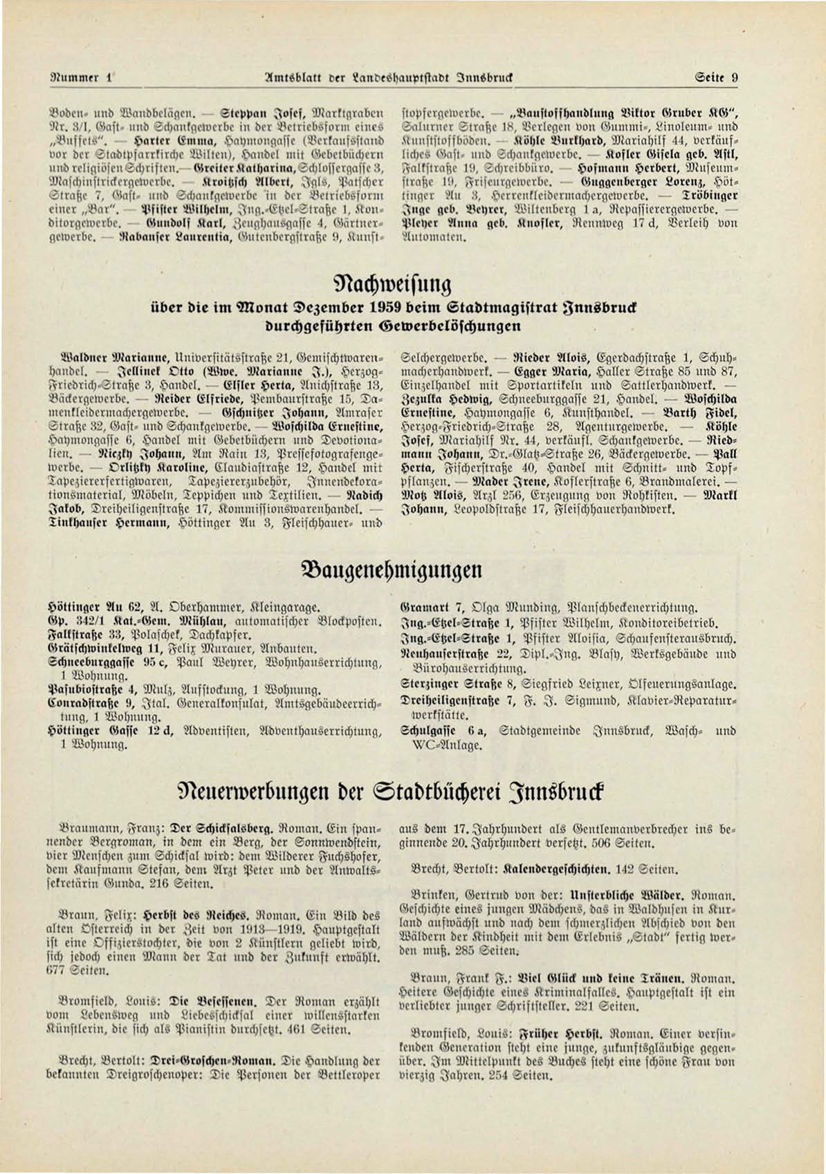 über die im Monat Dezember 1959 beim Stadtmagistrat Innsbruck