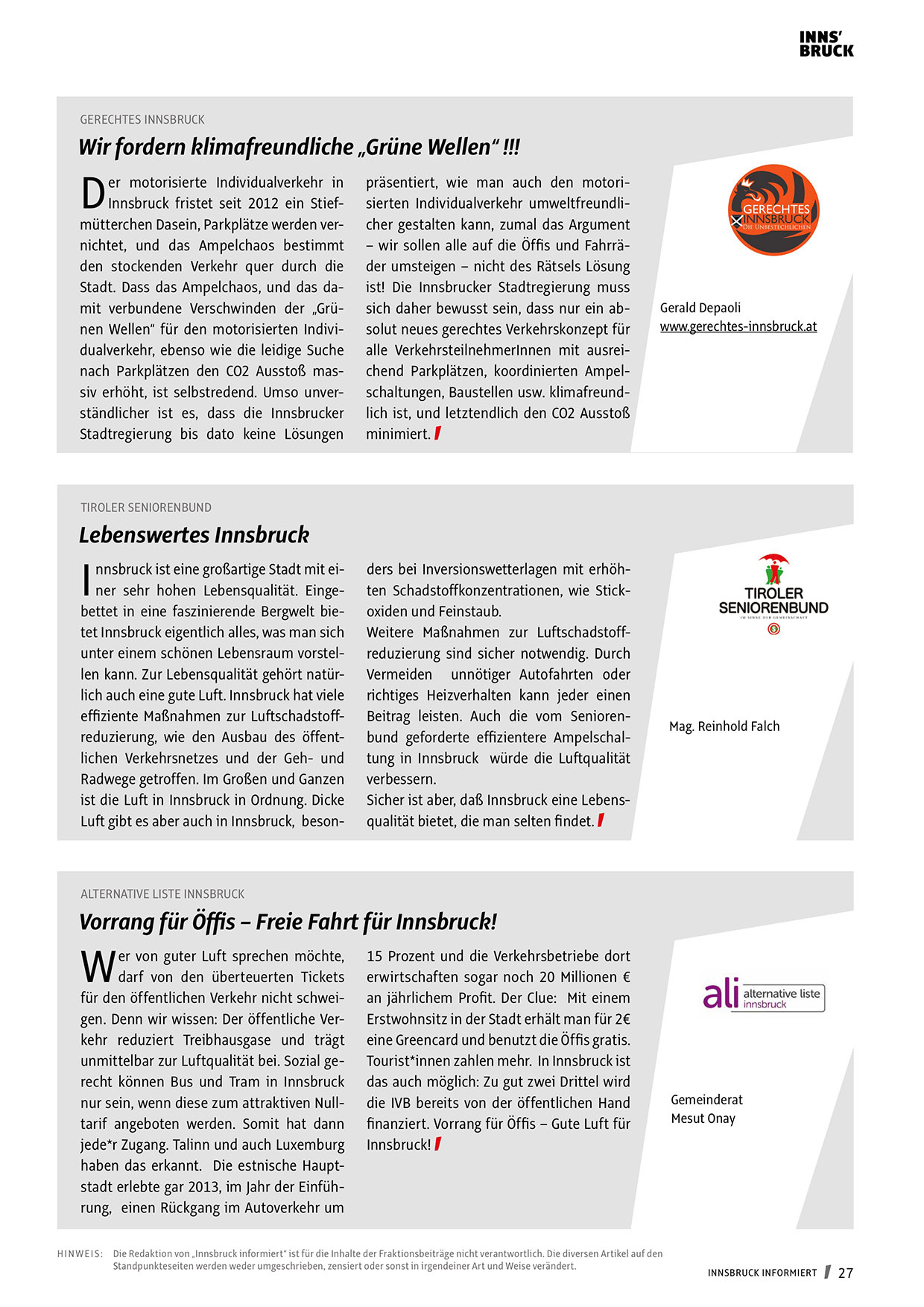 H I N W EI S : Die Redaktion von „Innsbruck informiert“ ist für die Inhalte der Fraktionsbeiträge nicht verantwortlich. Die diversen Artikel auf den