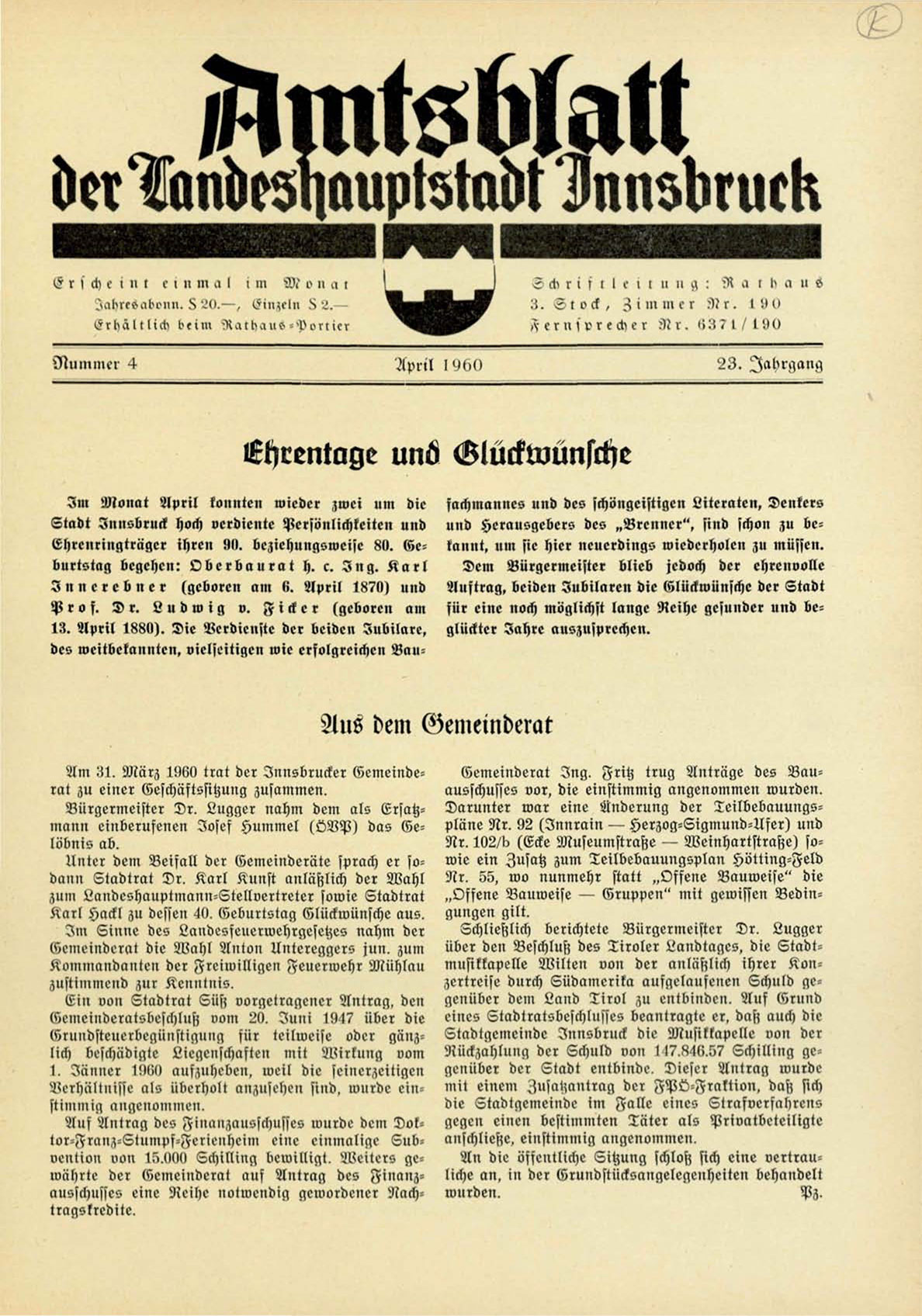 Am 31. März 1960 trat der Innsbrucker Gemeinderat zu einer Geschäftssitzung zusammen.