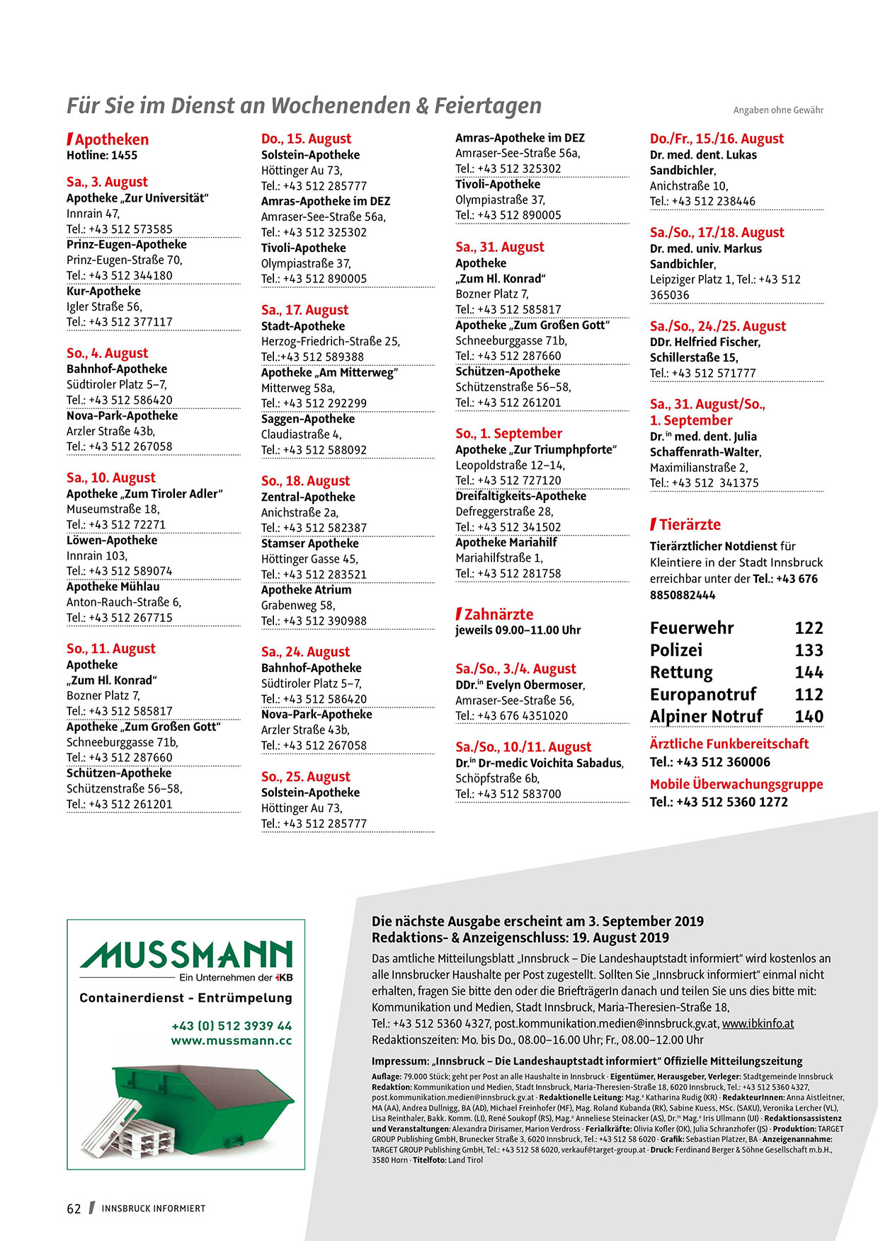 Redaktions- & Anzeigenschluss: 19. August 2019