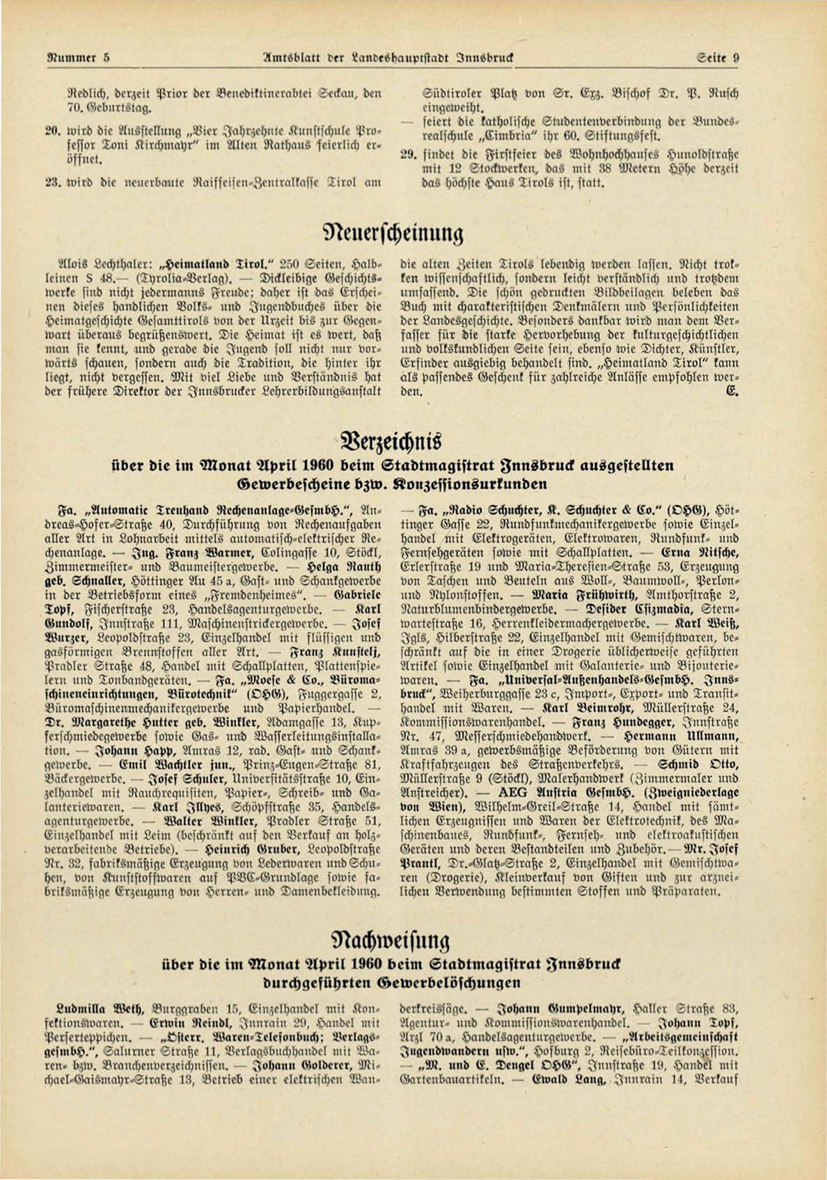 über die im Monat A p r i l I960 beim Stadtmagistrat Innsbruck ausgestellten