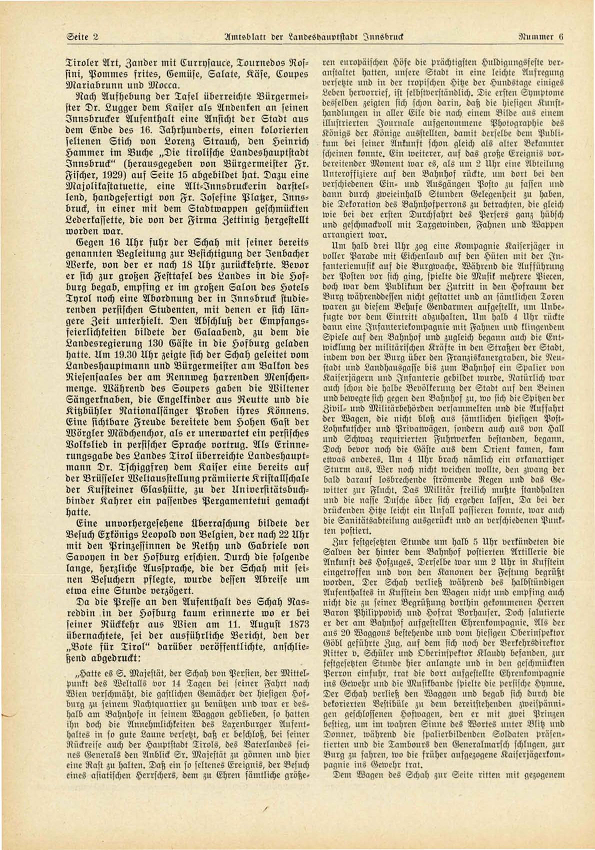 Volkslied in persischer Sprache vortrug. Als Erinnerungsgabe des Landes T i r o l überreichte Landeshauptmann Dr. Tschiggfrey dem Kaiser eine bereits auf