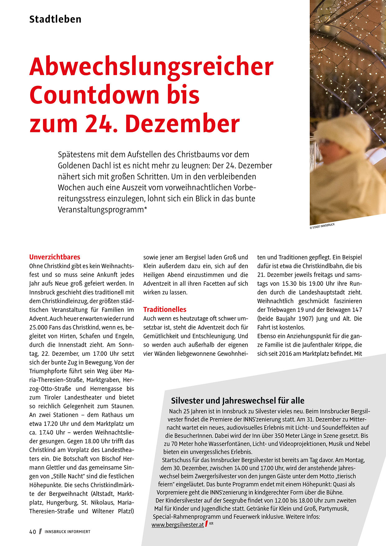 Höhepunkte. Die sechs Christkindlmärkte der Bergweihnacht (Altstadt, Marktplatz, Hungerburg, St. Nikolaus, MariaTheresien-Straße und Wiltener Platzl)