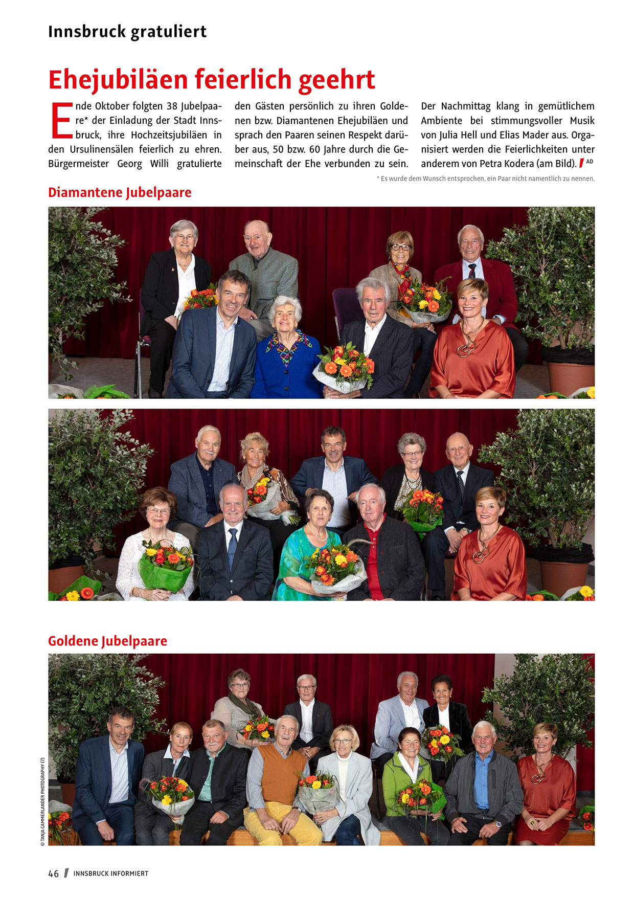 nde Oktober folgten 38 Jubelpaare* der Einladung der Stadt Innsbruck, ihre Hochzeitsjubiläen in