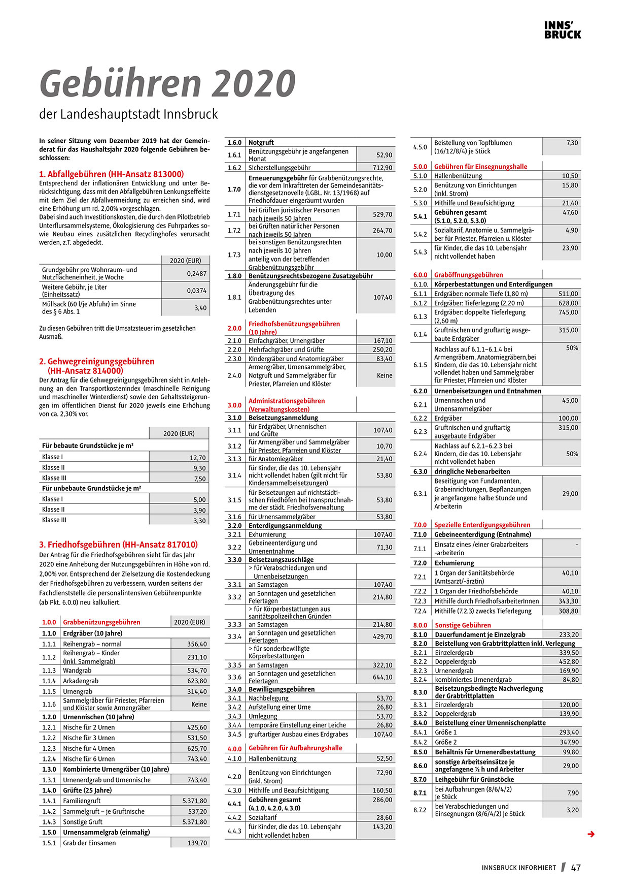 In seiner Sitzung vom Dezember 2019 hat der Gemeinderat für das Haushaltsjahr 2020 folgende Gebühren beschlossen:
