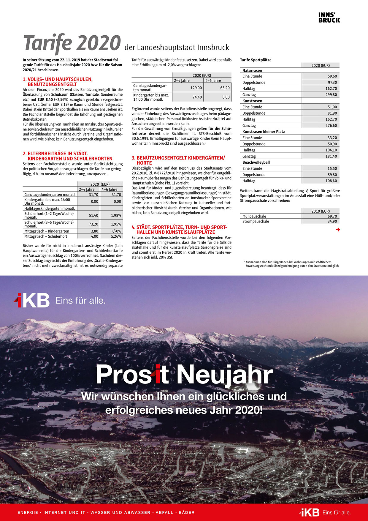 In seiner Sitzung vom 22. 11. 2019 hat der Stadtsenat folgende Tarife für das Haushaltsjahr 2020 bzw. für die Saison