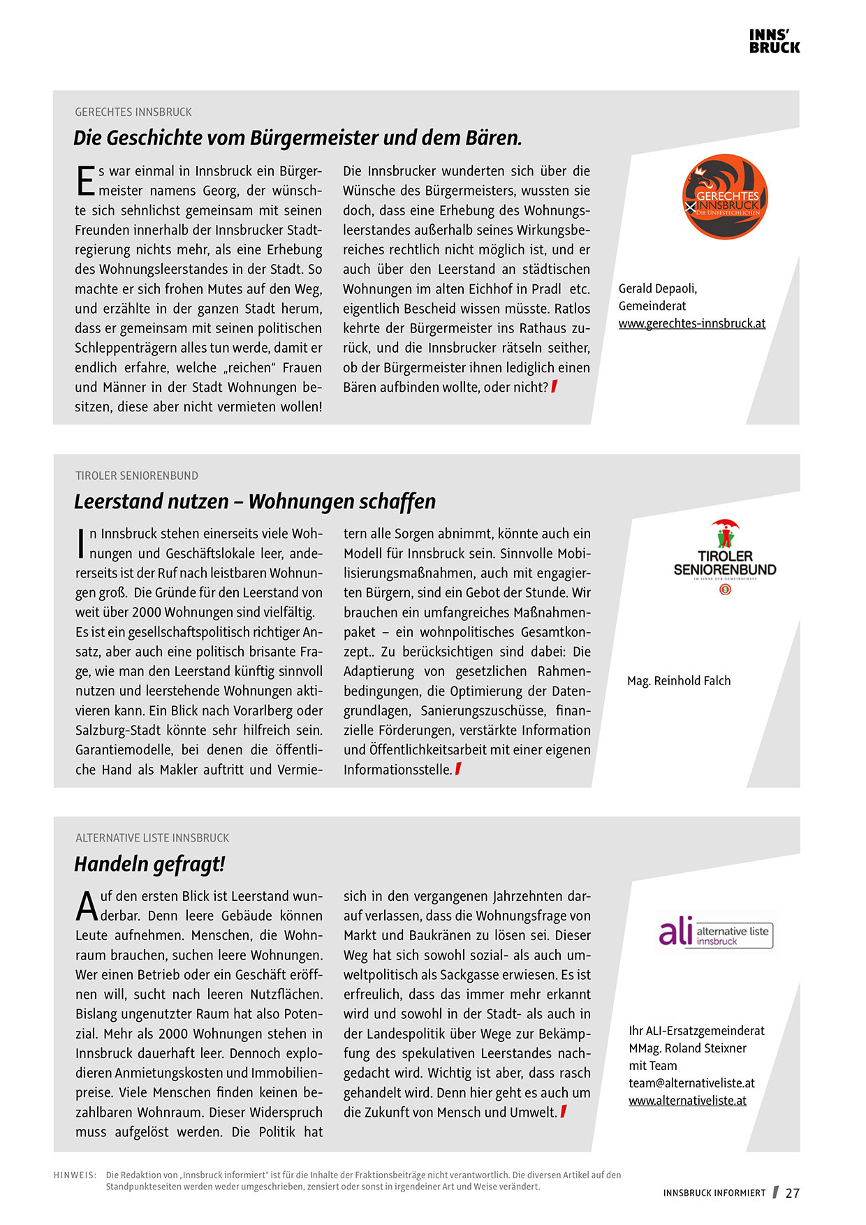 H I N W EI S : Die Redaktion von „Innsbruck informiert“ ist für die Inhalte der Fraktionsbeiträge nicht verantwortlich. Die diversen Artikel auf den