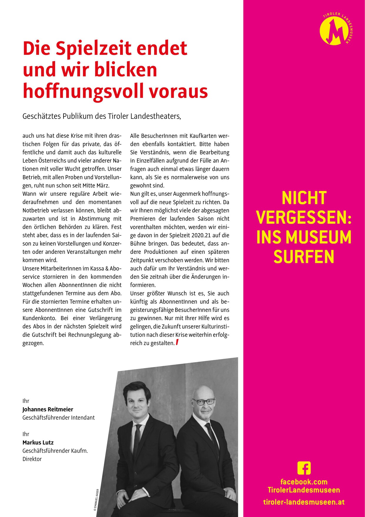 steht aber, dass es in der laufenden Saison zu keinen Vorstellungen und Konzerten oder anderen Veranstaltungen mehr