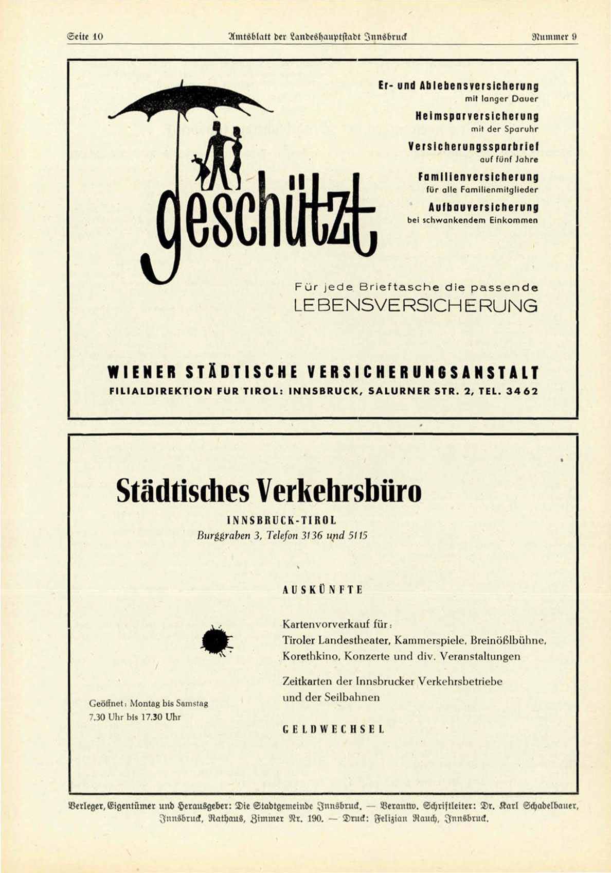Verleger, Eigentümer und Herausgeber: Die Stadtgemeiude Innsbruck. - Verantw. Schriftleiter: Dr. Karl Schadelbcmer,
