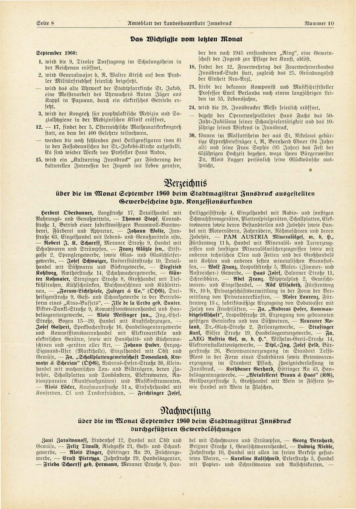 über die im Monat September I960 beim Stadtmagistrat Innsbruck ausgestellten