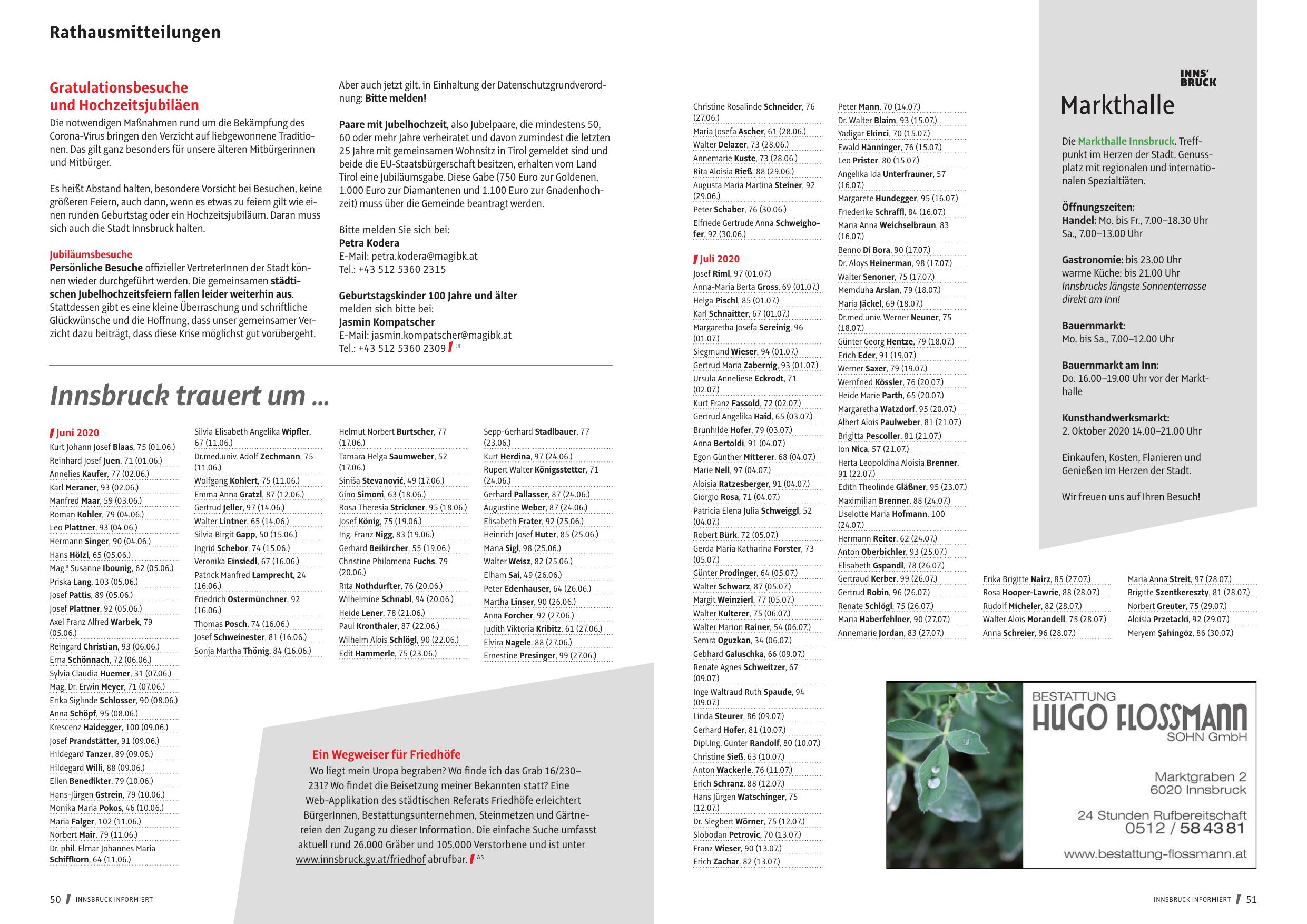Persönliche Besuche offizieller VertreterInnen der Stadt können wieder durchgeführt werden. Die gemeinsamen städtischen Jubelhochzeitsfeiern fallen leider weiterhin aus.