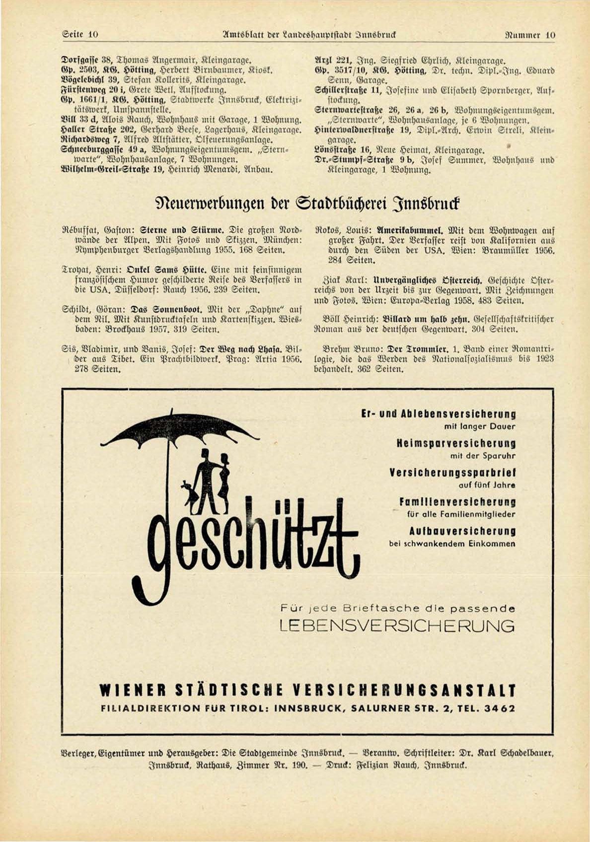 Verleger, Eigentümer und Herausgeber: Die Stadtgemeinde Innsbruck. — Vercmtw. Schriftleiter: Dr. Karl Schadellxiuer,
