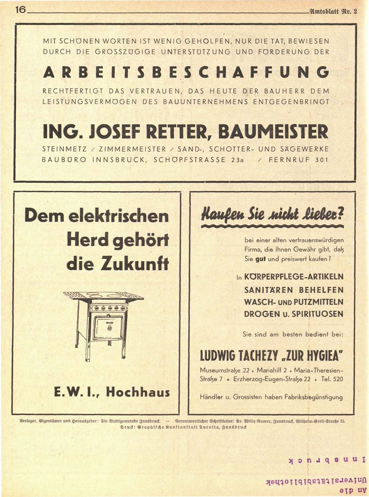 Verleger, Eigentümer und Herausgeber: Die Stadtgemeinde Innsbruck. — Verantwortlicher Schriftleiter: T>r. Willy Rumer, Innsbruck, Wilhelm-Greil-Ttraße 25.
