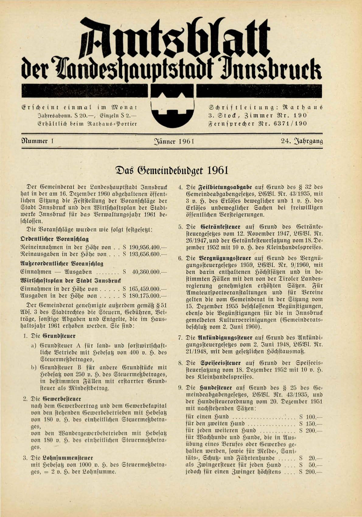 Stadt Innsbruck und den Wirtschaftsplan der Stadtwerte Innsbruck fiir das Verwallungsjahr 1961 beschlossen.