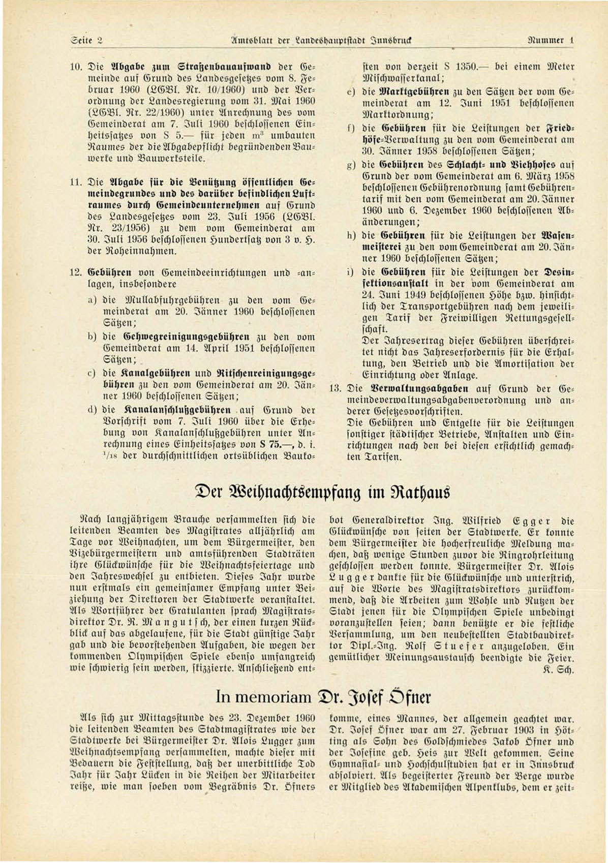c) die Kanalgebühren und Nitfchenreinigungsgebühren zu den vom Gemeinderat am 20. Jänner 1960 beschlossenen Sätzen"