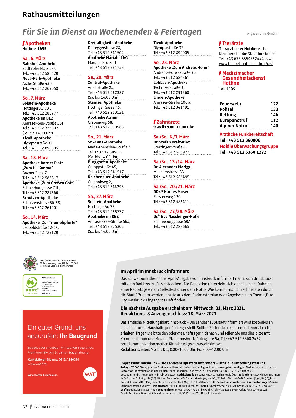 Auflage: 79.000 Stück; geht per Post an alle Haushalte in Innsbruck · Eigentümer, Herausgeber, Verleger: Stadtgemeinde Innsbruck